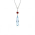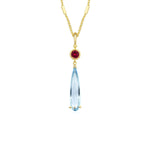 Crafted with a fiery round-cut red accent stone and a gracefully elongated faceted sky blue topaz pendant, this necklace is a nod to the iconic imagery of the film—flame and earth, heart and home. The serene glow of the sky blue stone evokes the open skies and boundless magic of Ingary, while the glowing red stone hints at the fire demon’s eternal spark.