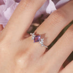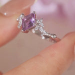 In a quiet clearing where moonlight meets wildflowers, the Lavendara Ring was born — a ring whispered into form by stardust and spring. Its center stone, a rhombus-cut amethyst, is a talisman of clarity and intuition, framed by delicate blossoms frozen mid-bloom.