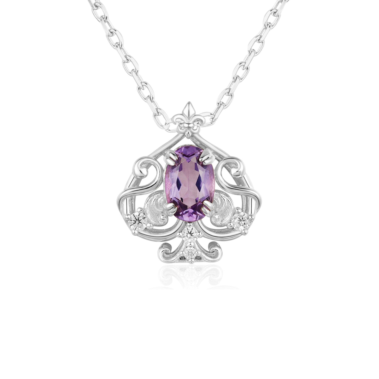 At its center lies a radiant oval-cut amethyst, cradled by ornate scrollwork and gothic botanical flourishes that mirror the elegant curves of a blooming spade. This fusion of poker symbolism and nature’s artistry captures the balance between intellect and instinct—making it a powerful statement for those who trust their inner voice.