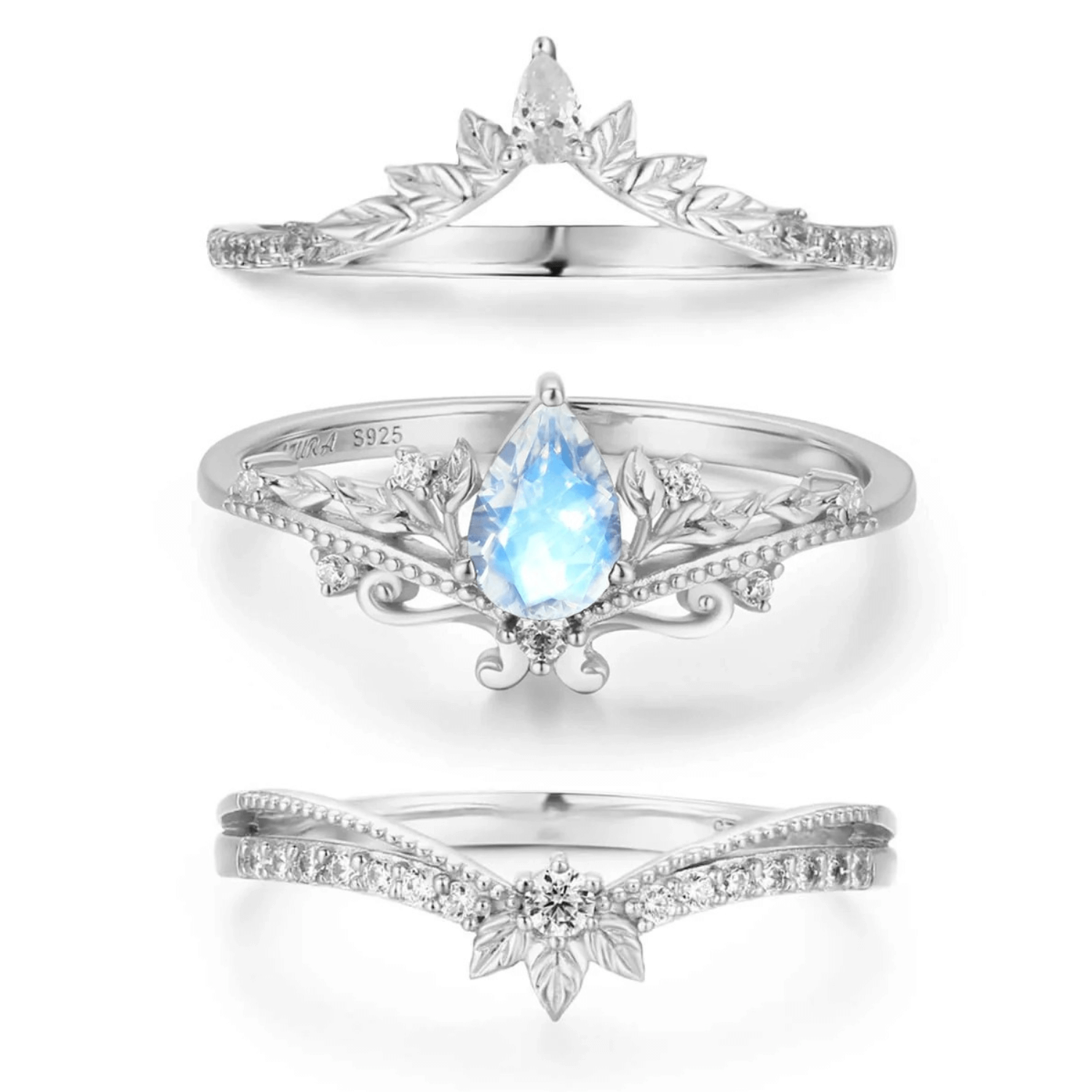 Inspired by the quiet strength of nature, the Lotus Moonstone, Abloom, and Woodland Ring Set is a crown for those who bloom in their own time.