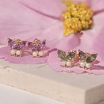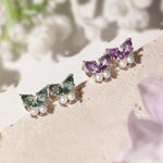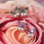 Its wings shimmer in amethyst, a gemstone long believed to calm the spirit and awaken inner clarity. Paired with luminous pearls, these earrings reflect the grace of becoming—gentle, intentional, and full of quiet strength.