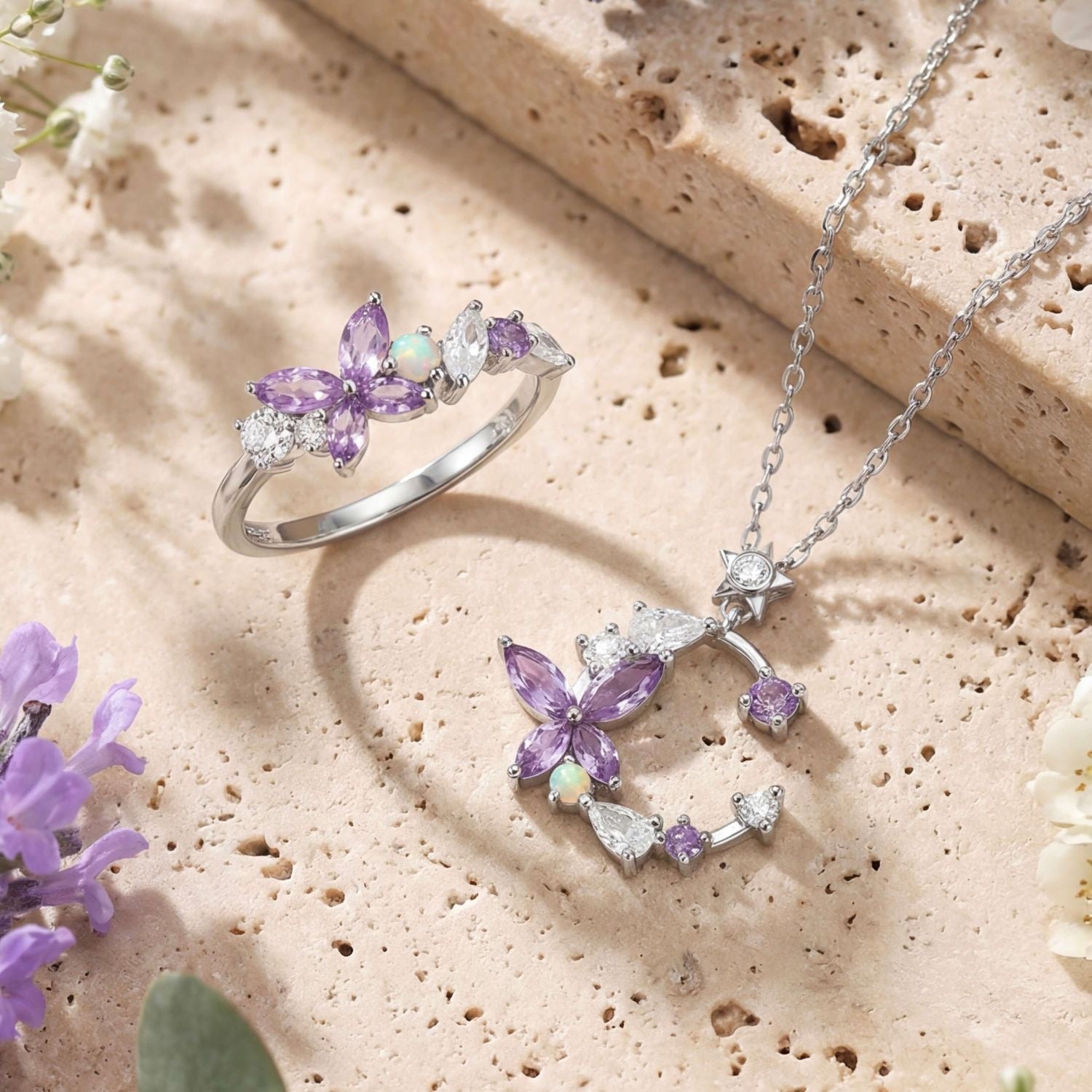 Bring a dreamy, symbolic touch to your collection with our amethyst butterfly ring and necklace set. This nature-inspired jewelry features soft marquise-cut amethyst gemstones and a glowing opal, delicately forming a butterfly in mid-bloom—a gentle symbol of transformation and grace.