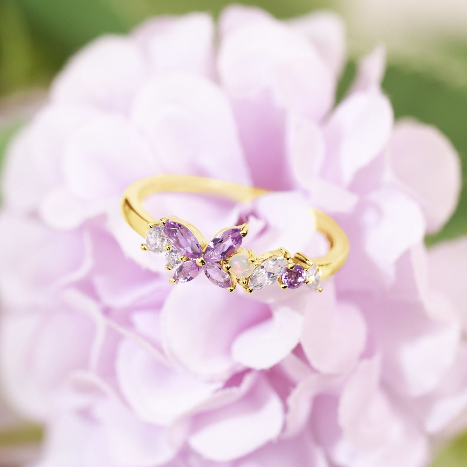 Bring a dreamy, symbolic touch to your collection with our amethyst butterfly ring. This nature-inspired ring features soft marquise-cut amethyst gemstones and a glowing opal, delicately forming a butterfly in mid-bloom—a gentle symbol of transformation and grace.