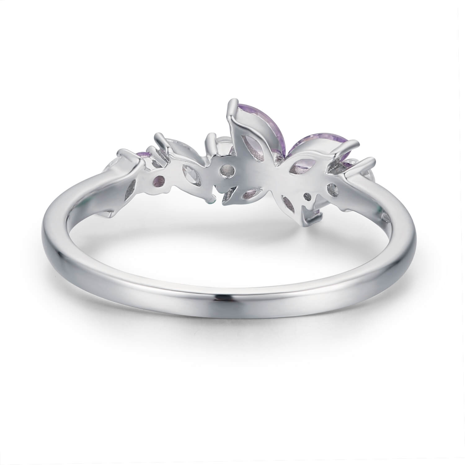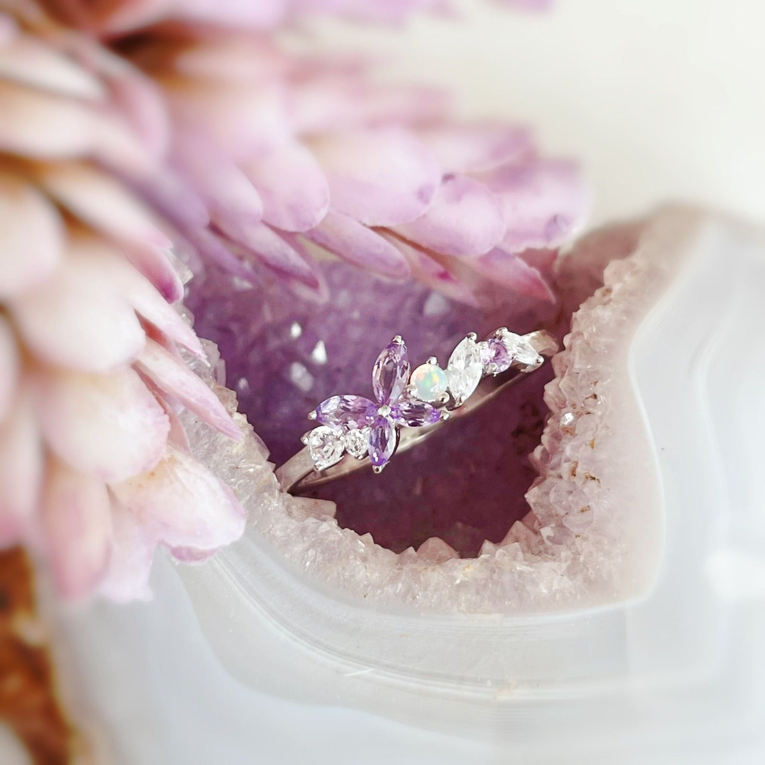 Bring a dreamy, symbolic touch to your collection with our amethyst butterfly ring. This nature-inspired ring features soft marquise-cut amethyst gemstones and a glowing opal, delicately forming a butterfly in mid-bloom—a gentle symbol of transformation and grace.