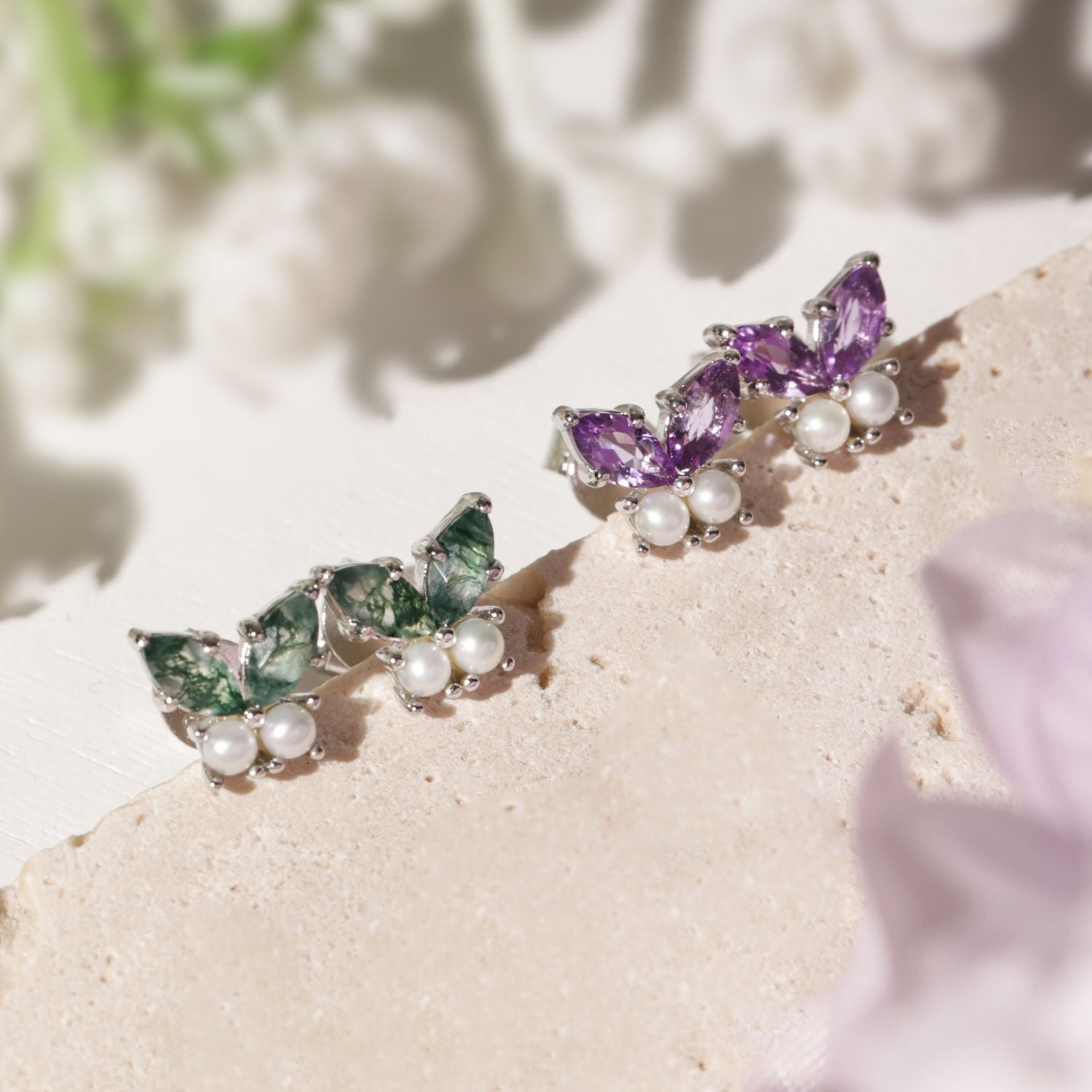 The wings are carved from moss agate, each pair one-of-a-kind like the leaf patterns etched by time, paired with luminous pearls that echo the purity of dew. These earrings celebrate stillness, grounding, and the unseen magic that grows slowly and powerfully beneath the surface.