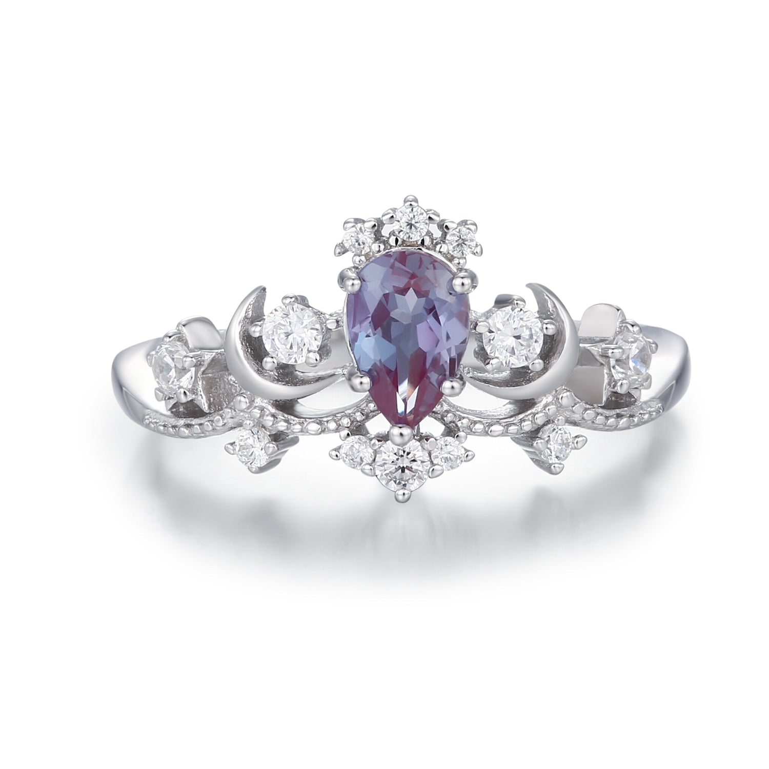 Crafted with intricate detail, this enchanting moon and star ring features a mesmerizing pear-cut alexandrite gemstone that reflects shades of twilight. Framed by twin crescent moons and surrounded by radiant stars, the design symbolizes balance, protection, and the mystery of dreams.