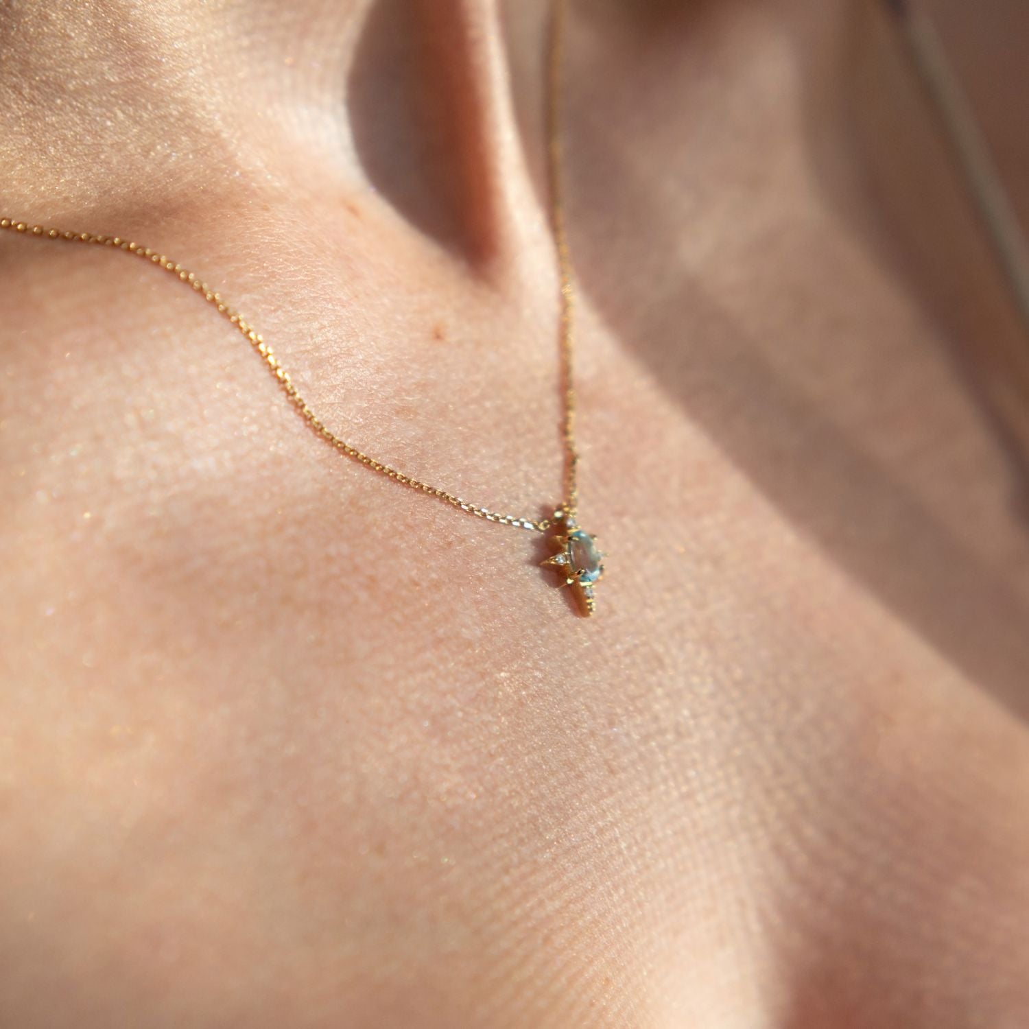At the heart of the necklace is a stunning oval sky blue topaz, reminiscent of the sunlit sea and cloudless skies. Known as a stone of calm, clarity, and communication, blue topaz brings soothing energy to the wearer—perfect for dreamers and free spirits alike.