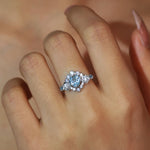 Framing the center stone are sparkling white accents, set in a graceful crown of light. On each side, sculpted blooms resemble sea roses, highlighted with blue stones.