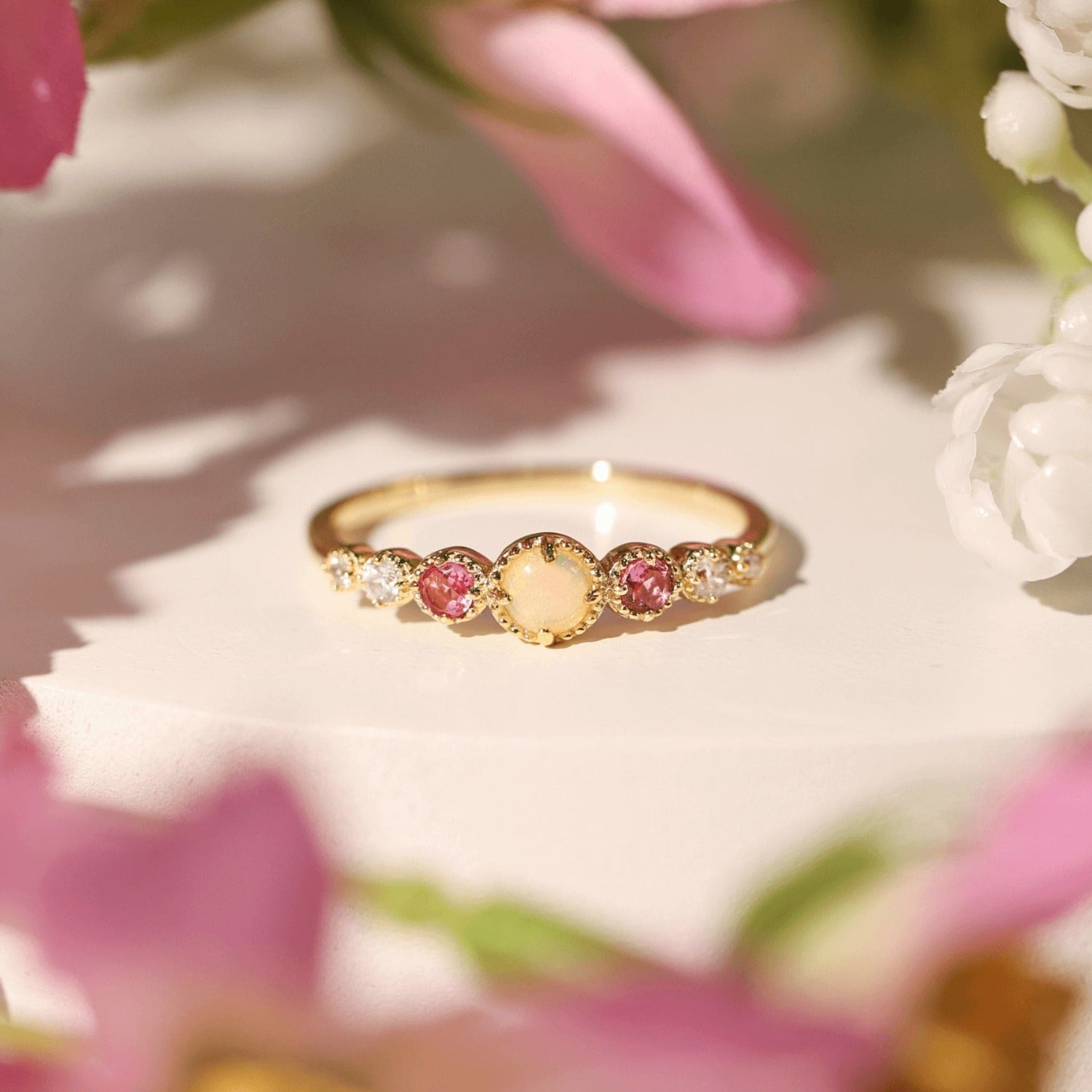 A luminous opal sits at the center of the ring, its colors shifting effortlessly with the light. Pink tourmaline flanks it with soft, romantic tones, and diamond-like accents glitter like stars guarding a glowing horizon.