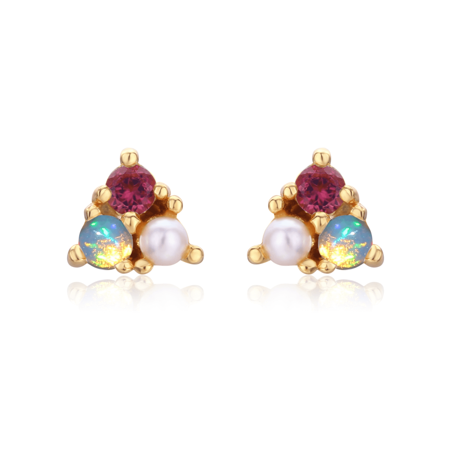 Featuring a luminous opal, a vibrant pink tourmaline, and a classic pearl, each gemstone reflects the blessings it bestows: light, serenity, and joy—brought together in a sleek triangular design that unites them in perfect harmony.