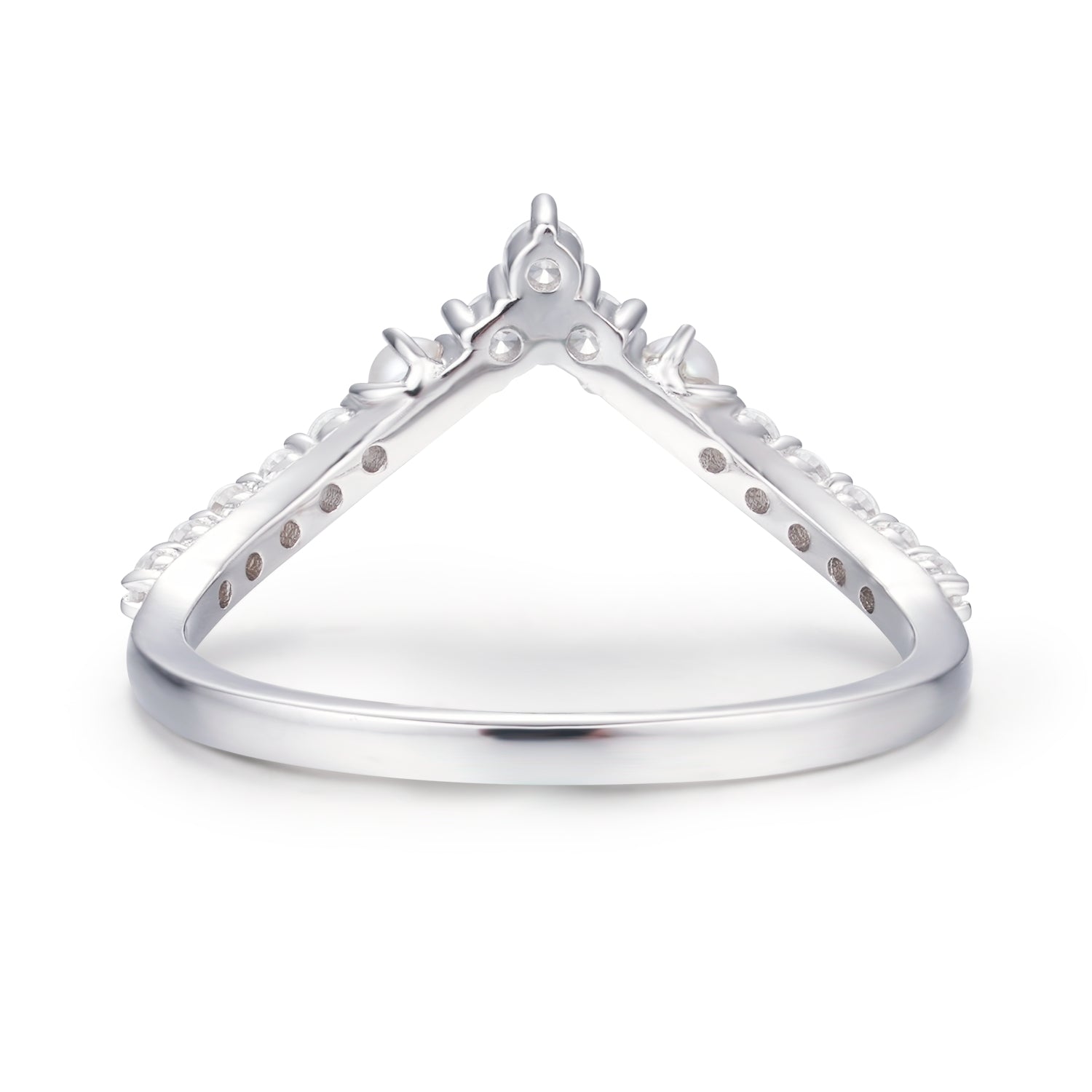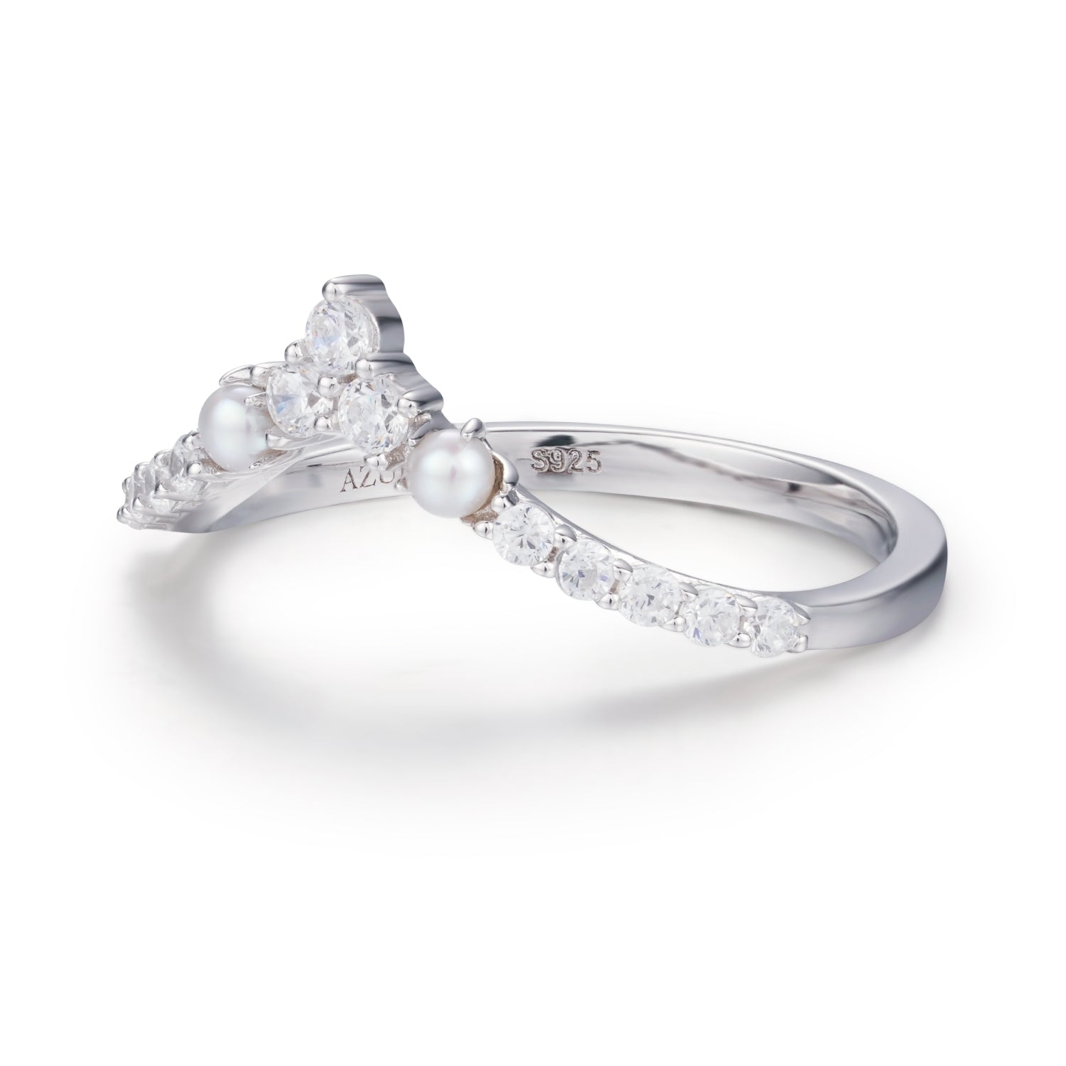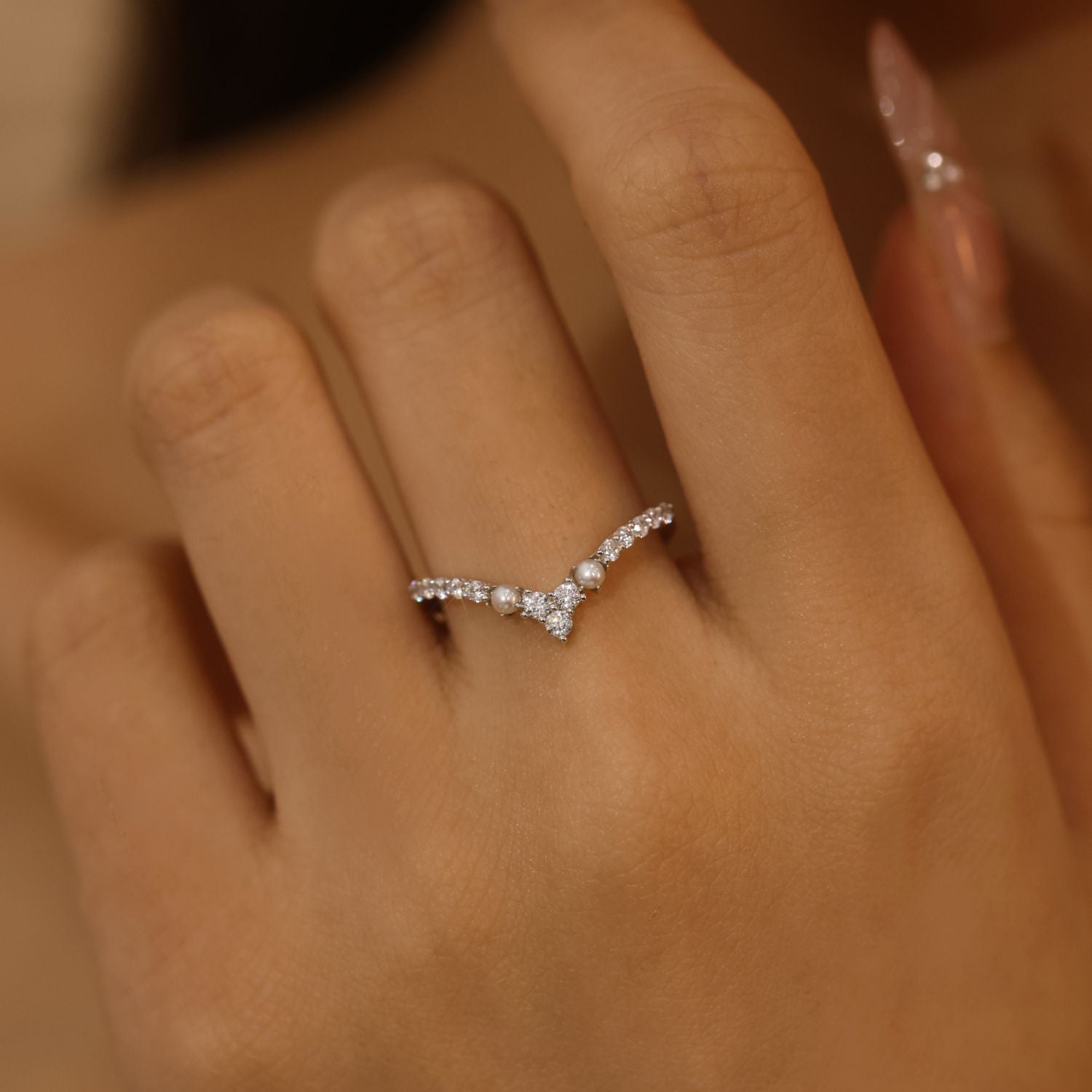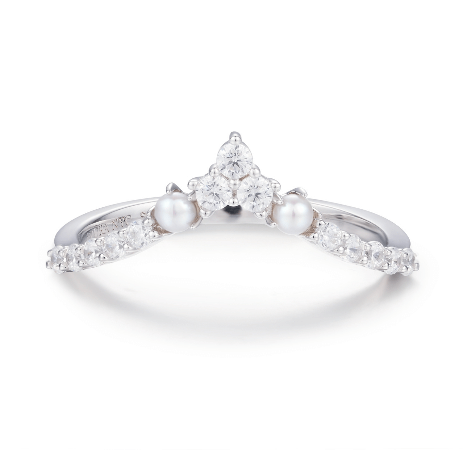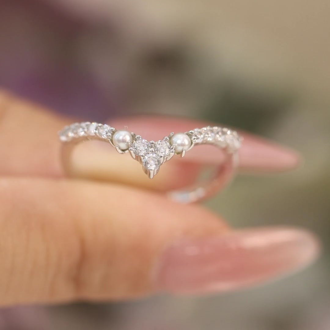 Whether you're looking for a dainty pearl wedding band, a stackable tiara ring, or a minimalist bridal crown ring, the Pearl Crest Chevron Band is a timeless choice with mythic charm.