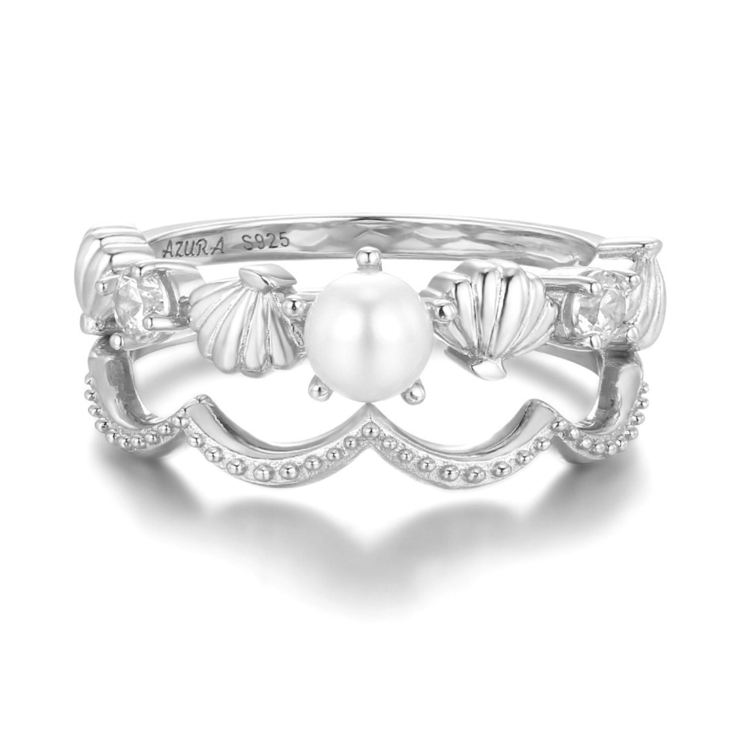 The stacking ring complements it with intricate scalloped edges and milgrain detailing in a gentle wave-like curve — reminiscent of crests that echo the rhythmic dance of the ocean. Sparkling accents glisten like sunlight on water, adding a touch of ocean-born magic.
