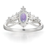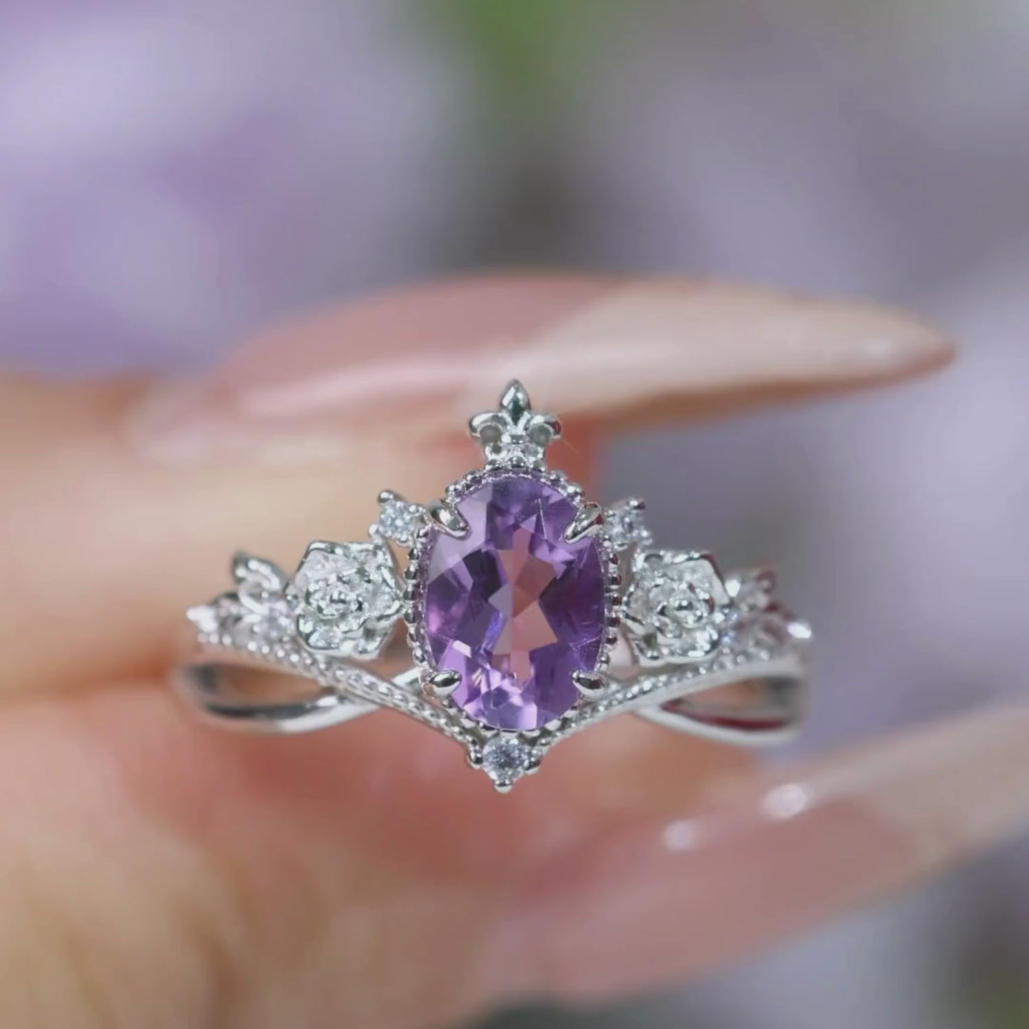 At the heart of this ring lies a stunning oval amethyst gemstone, celebrated for its rich purple hues and captivating depth, reminiscent of twilight skies. Its vibrant color creates a mesmerizing effect, evoking calm, clarity, and spiritual balance.