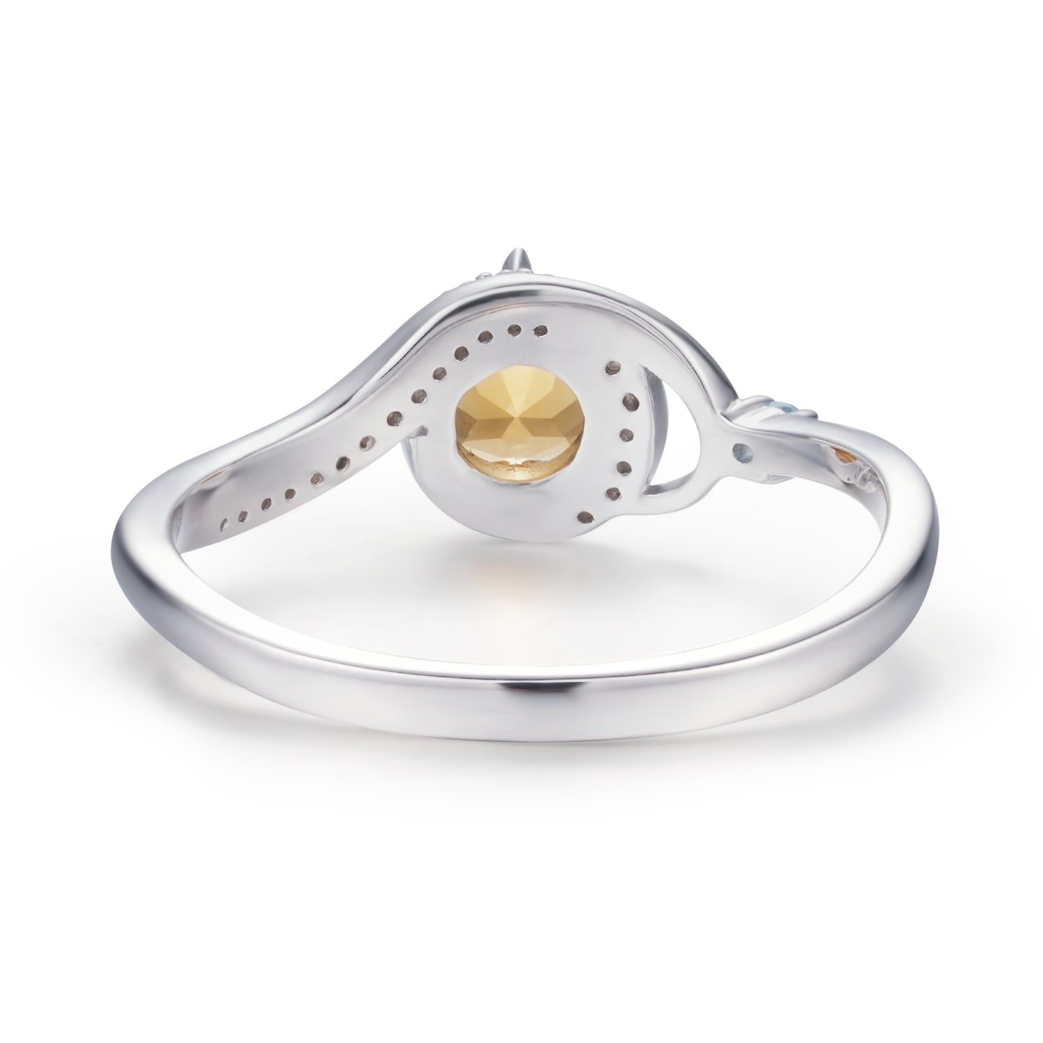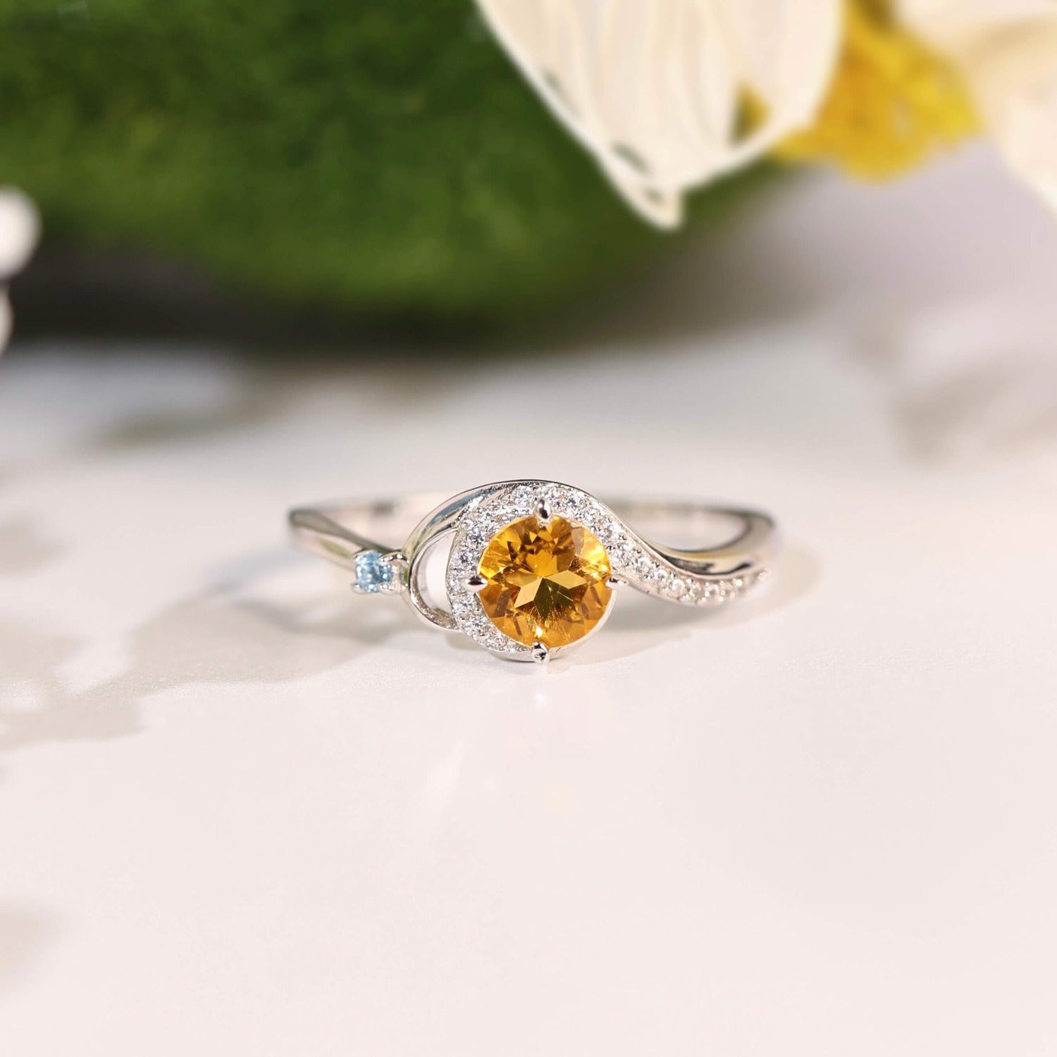 At its center glows a radiant citrine gemstone, symbolizing the warmth of dawn, mental clarity, and inner strength. Beside it, a Swiss blue topaz reflects the open sky, offering peace, guidance, and a touch of serenity to dreamers and wanderers. Together, these two gems represent a harmonious balance between sunlight and sky. Cradled in a wavy band that flows like a breeze, this air element ring captures the graceful, ever-shifting energy of the wind.