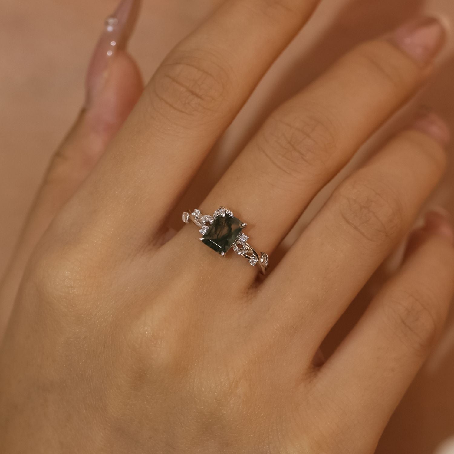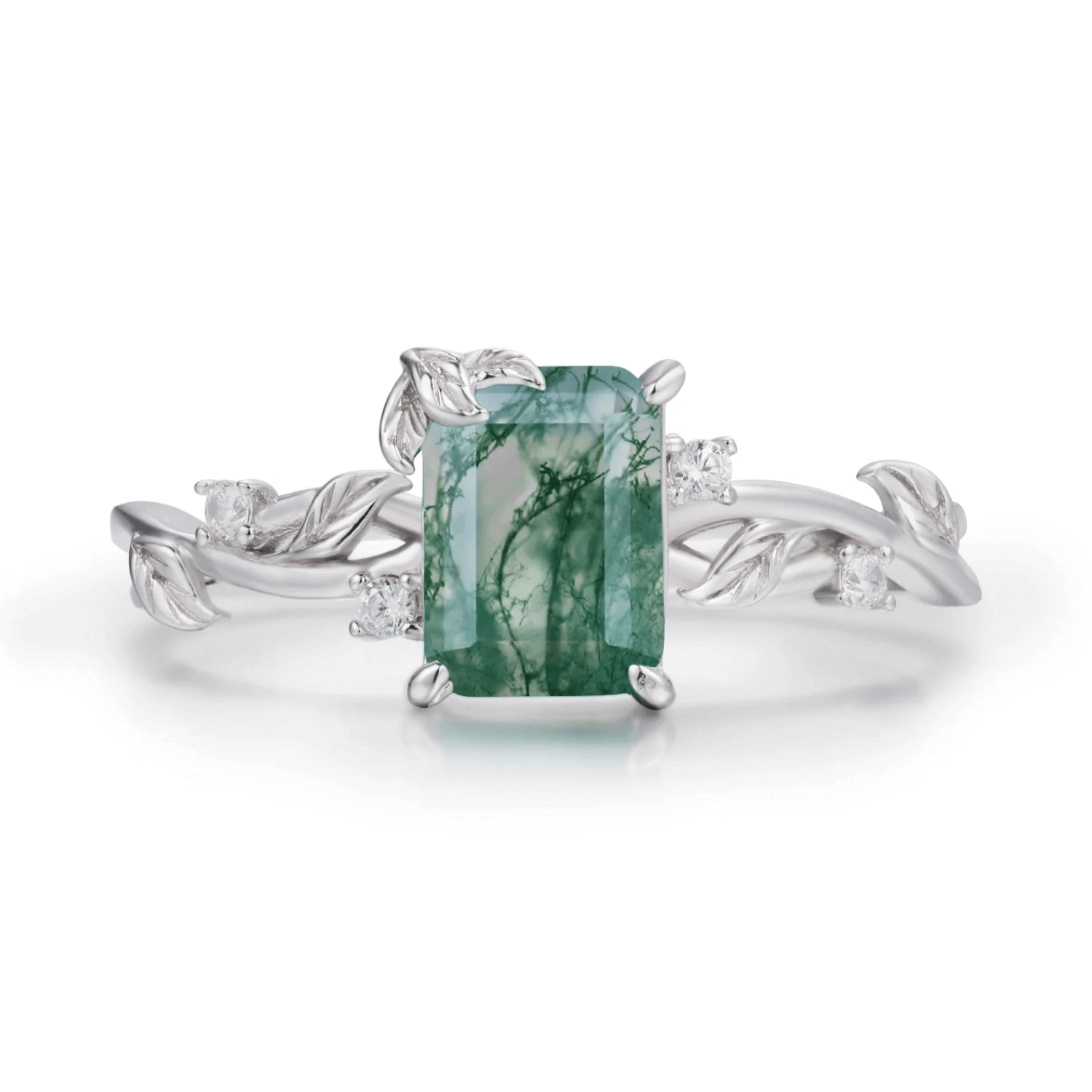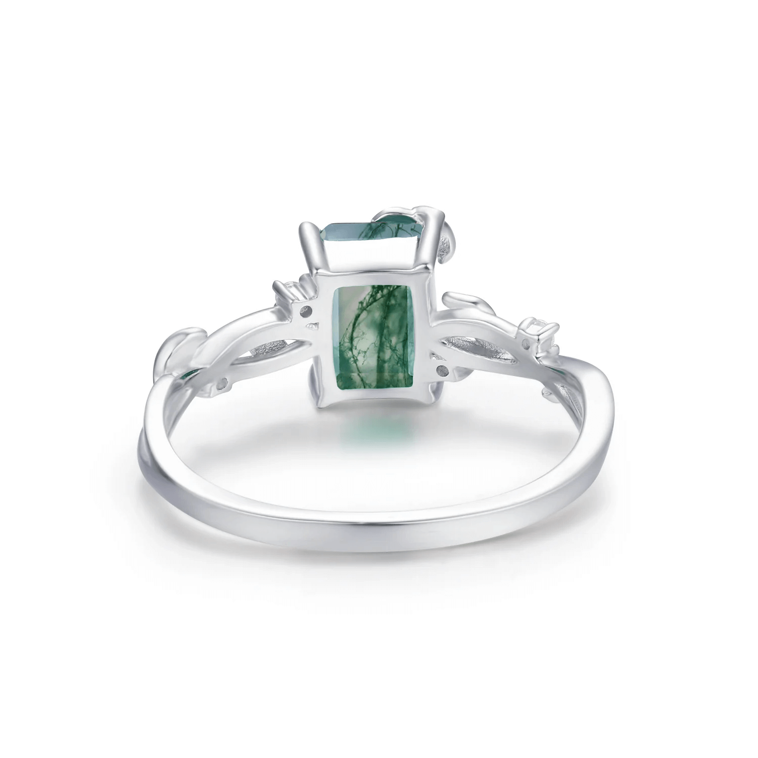 ✦ Center Stone: 8x6mm emerald-cut Moss Agate