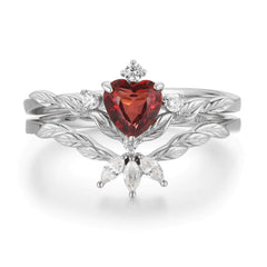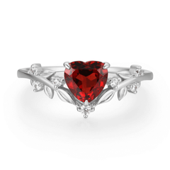 At its heart, a fiery marquise-cut Mozambique red garnet glows like a living ember, held in a rose-gold flame. Three delicate white accent stones rest beneath the garnet, shimmering like dancing sparks. Each one represents clarity, rebirth, and unwavering will.
