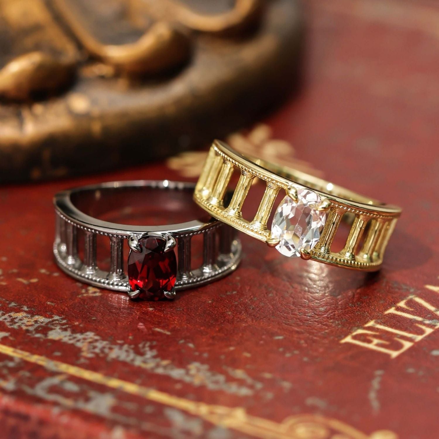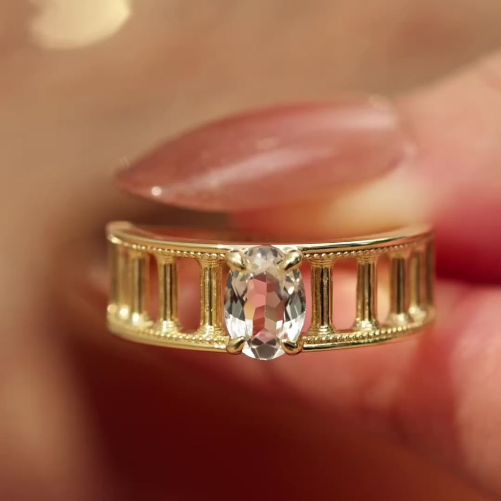 Inspired by ancient Greek architecture, this Parthenon ring blends sculpted column detailing, classical symmetry, and fine milgrain accents within an open colonnade form. The band reflects the rise of marble pillars, while an oval-cut white topaz in warm yellow gold glows like a sunrise over Athens—symbolizing clarity, strength, and renewal.