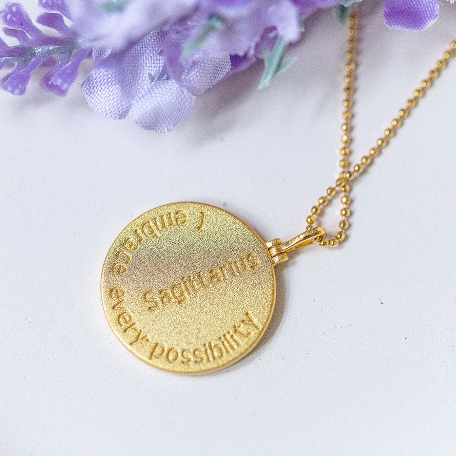 The reverse side bears the empowering mantra: Sagittarius – “I embrace every possibility.” Worn close to the heart, this necklace serves as a daily reminder of courage, optimism, and the beauty of freedom.
