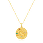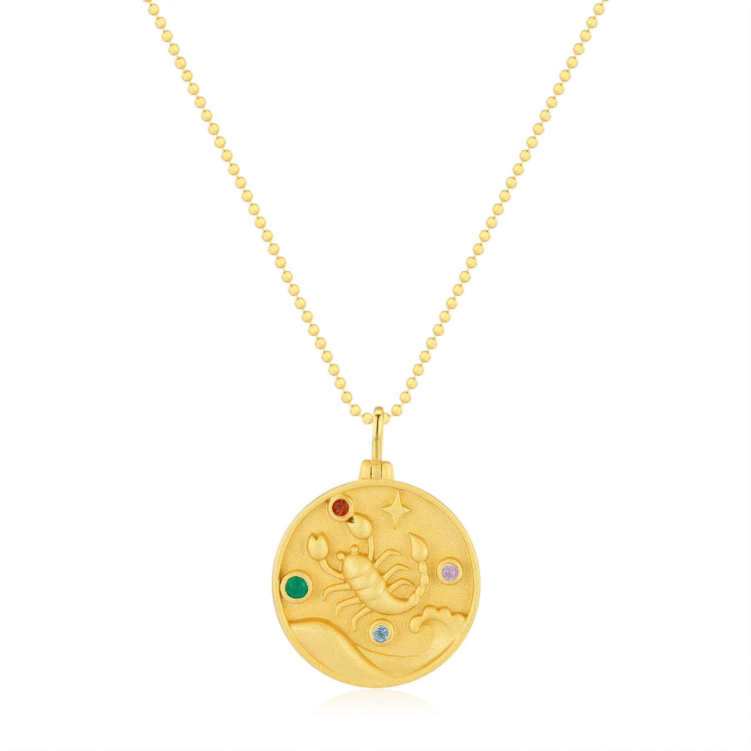 To honor this cosmic task, a talisman was made—the Scorpio Zodiac Mantra Necklace. One side features the Scorpion, surrounded by vibrant gemstones.