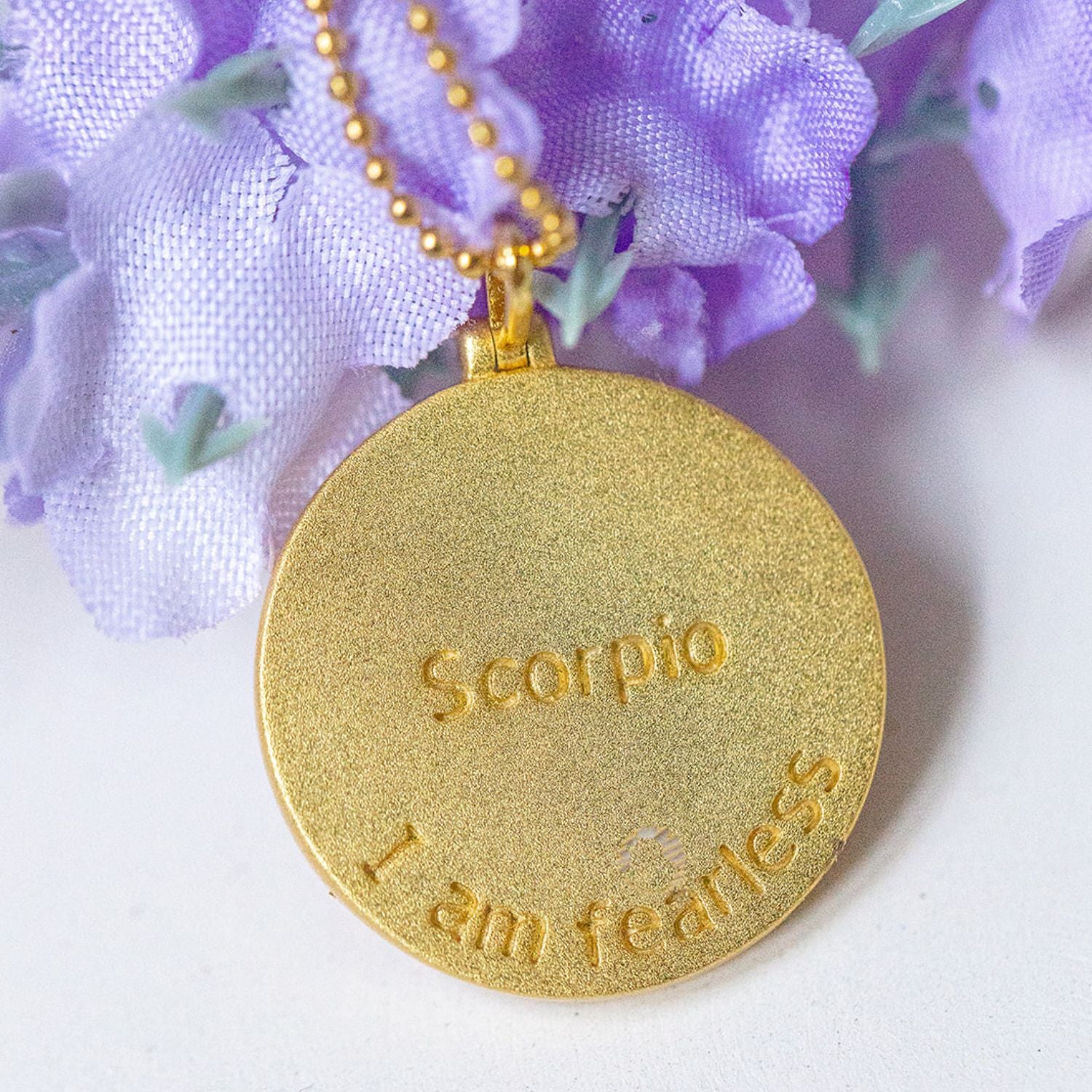 The reverse side bears the empowering mantra: Scorpio – “I am fearless.” Worn close to the heart, this necklace serves as a daily reminder of inner strength, emotional depth, and the beauty of transformation.