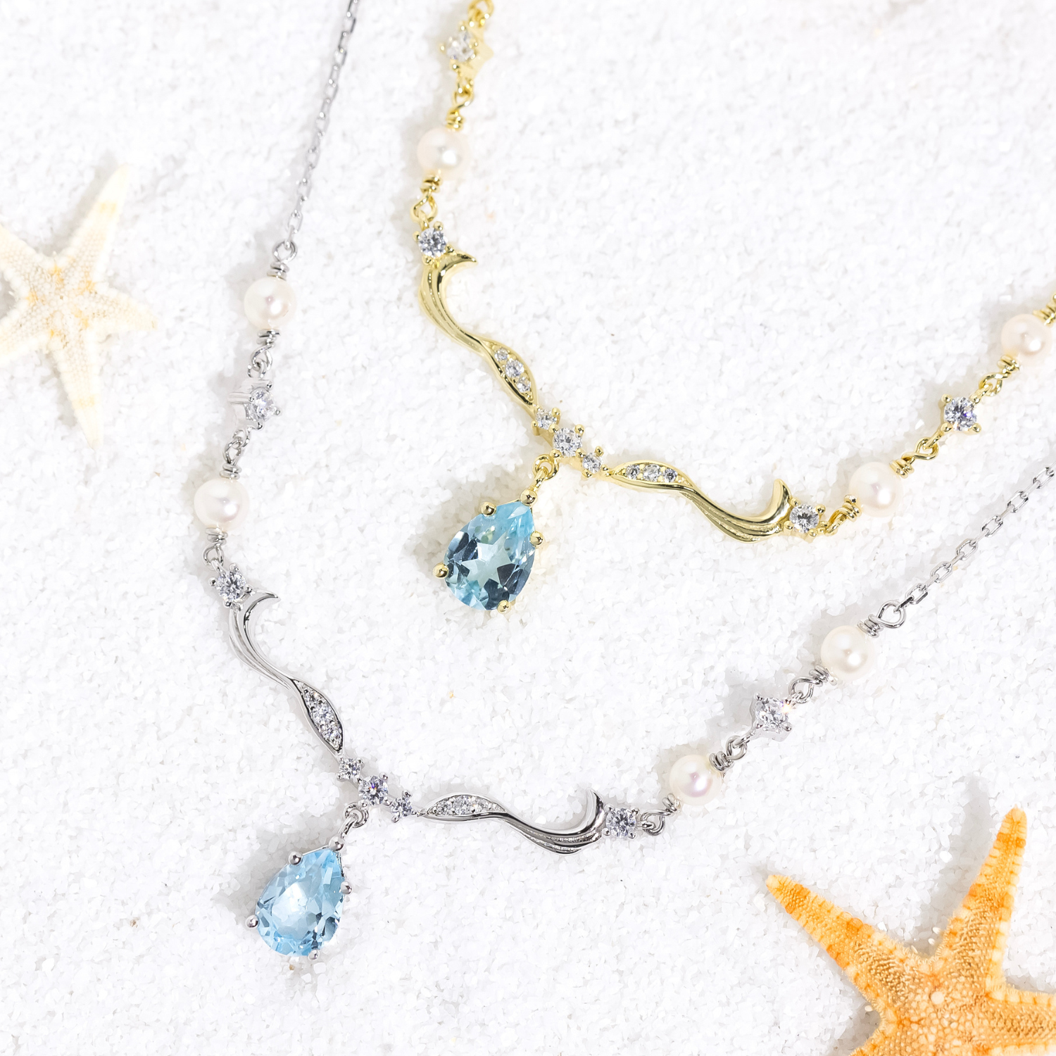 Surrounded by lustrous freshwater pearls and delicate shimmering accents, the necklace’s design evokes gentle waves and starlit horizons.