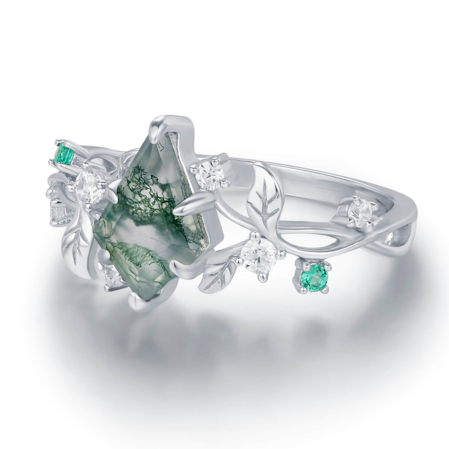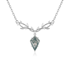 At its heart lies a captivating kite-shaped moss agate stone, featuring intricate natural patterns that echo a vibrant moss-covered forest, bringing a piece of the wild woods to your fingertips.