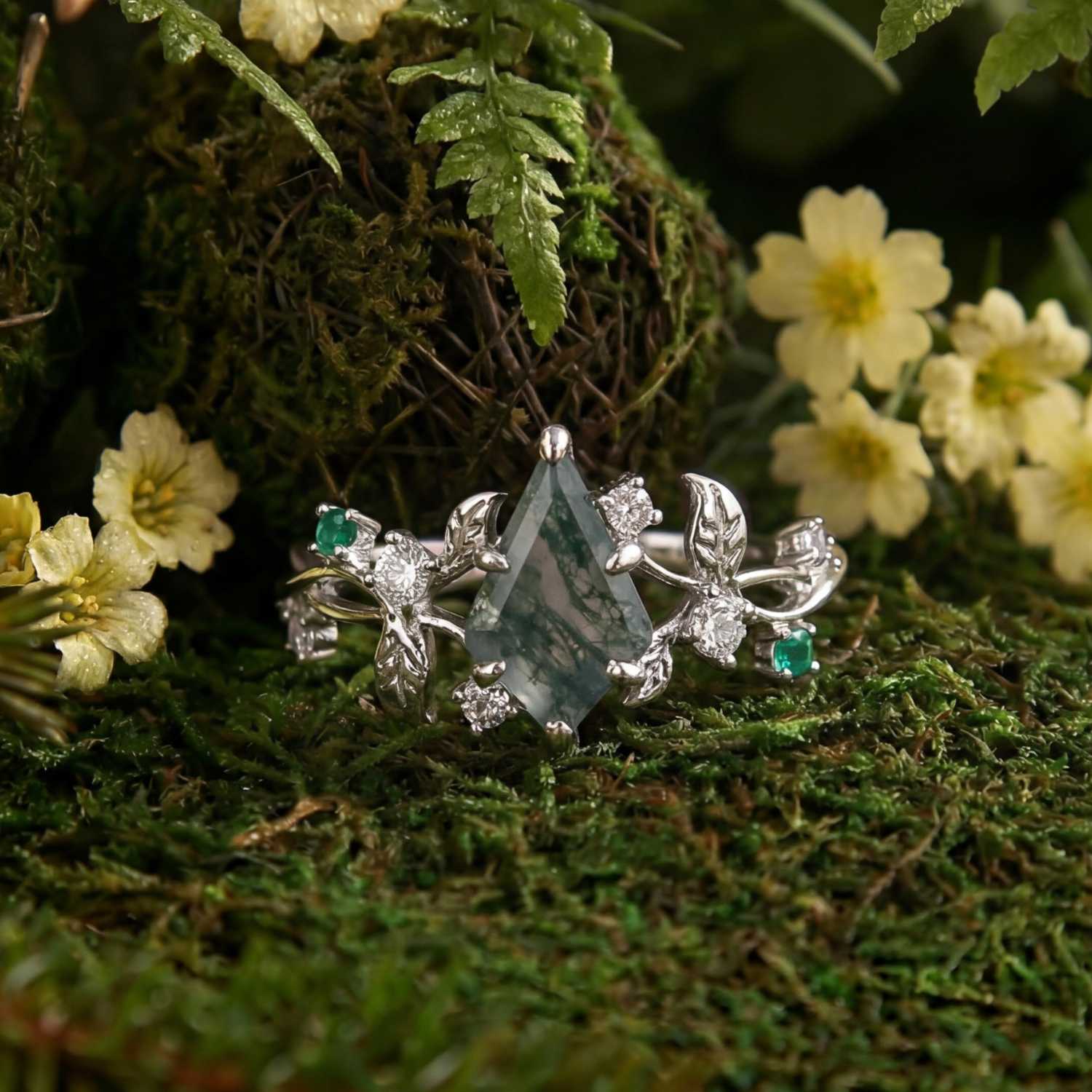 The Secret Garden Moss Agate Emerald Ring is a hidden treasure, embodying the enchanting mystique of nature.