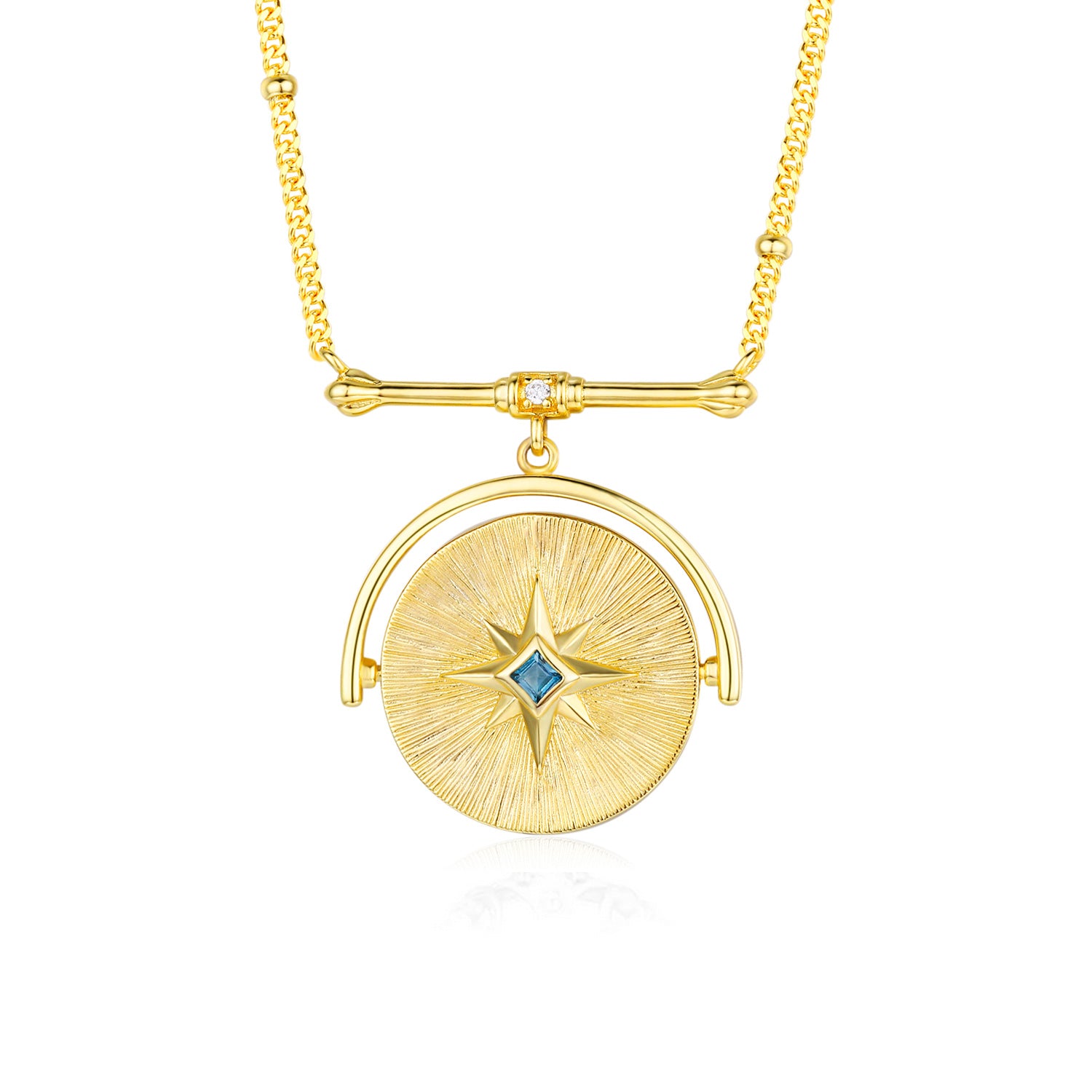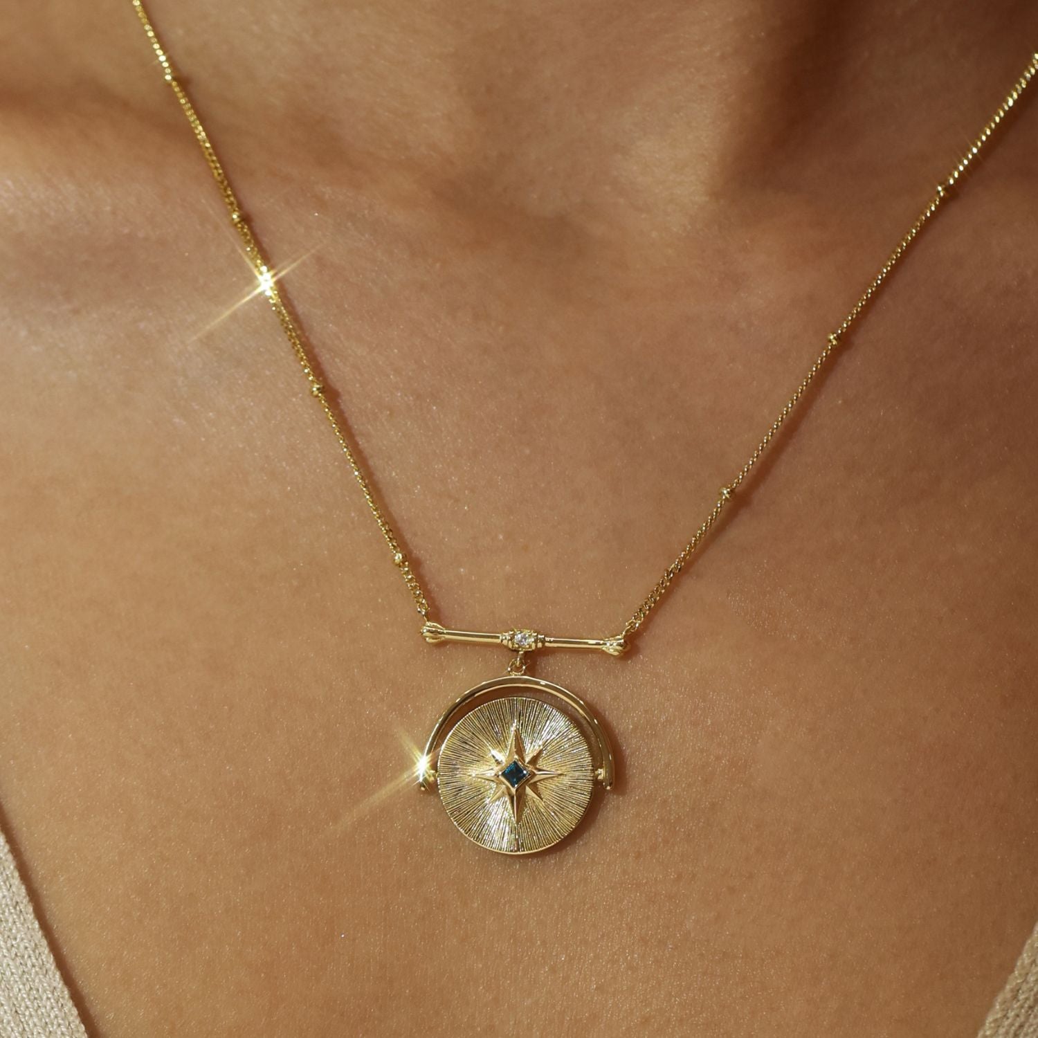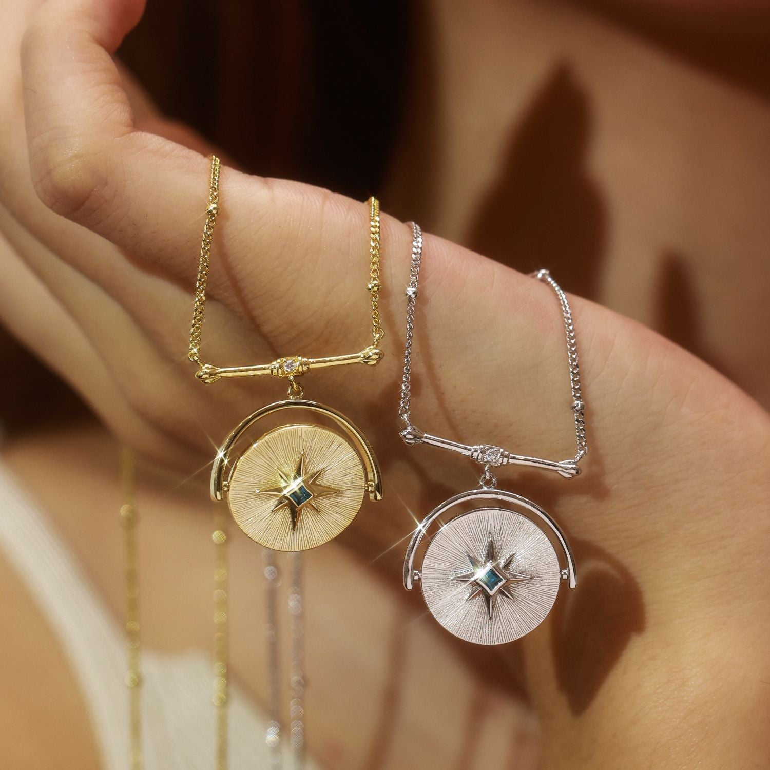 This handcrafted necklace features a radiant square deep London blue topaz at its core. It’s framed by an eight-pointed star, representing infinite paths, divine alignment, and the ever-unfolding mystery of the universe.