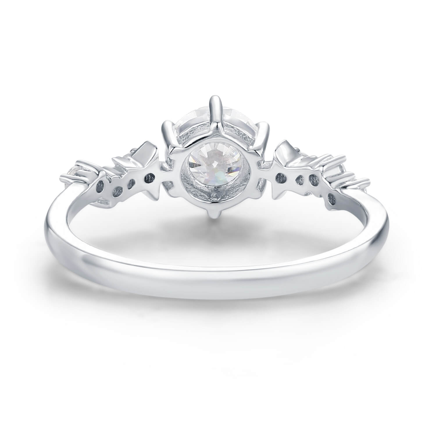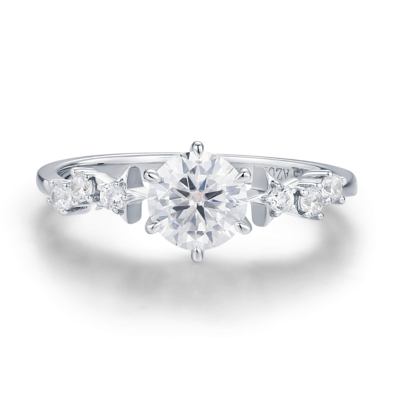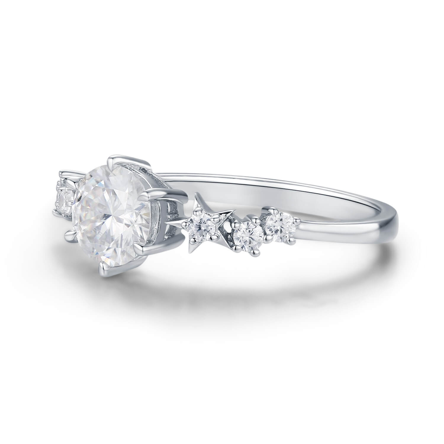 Featuring a breathtaking round moissanite center stone, this ring captures the brilliance and sparkle of a starlit night—radiating the pure light of love’s most heartfelt promises.