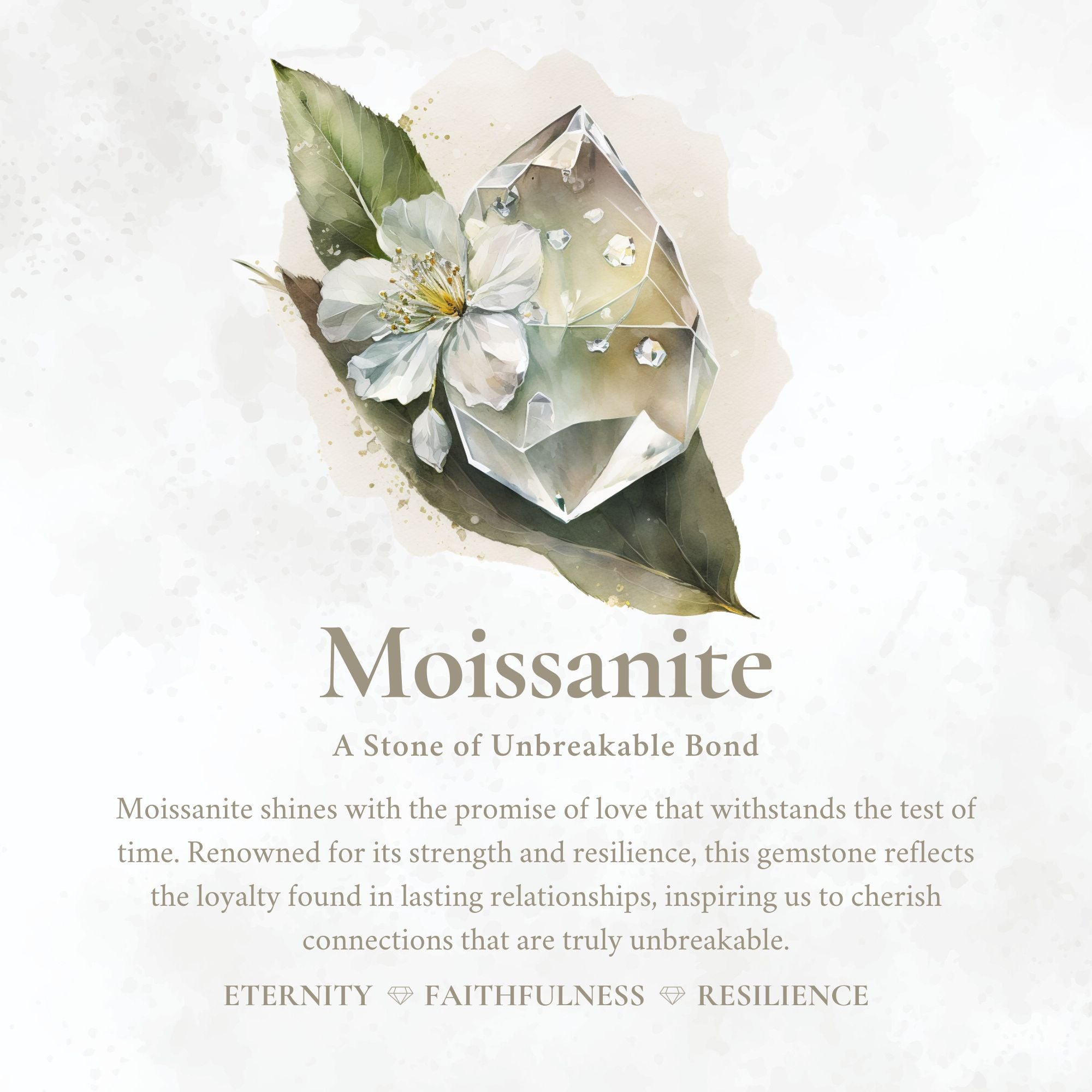 Powers: Moissanite awakens inner radiance. It is said to re-establish a connection to our true selves and with our higher spiritual realms. A brilliant gem that also aids in lowering stress levels, improving focus, and achieving mental clarity.