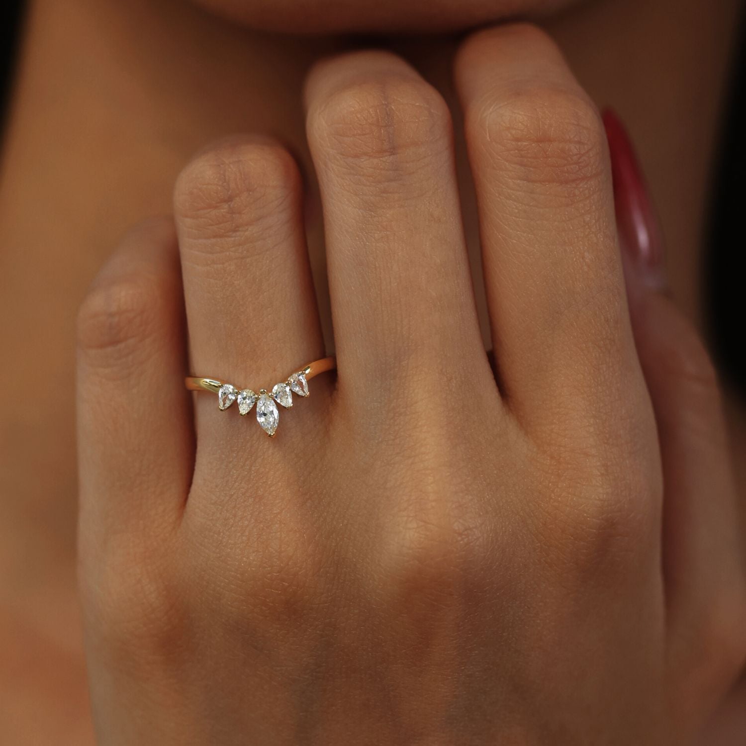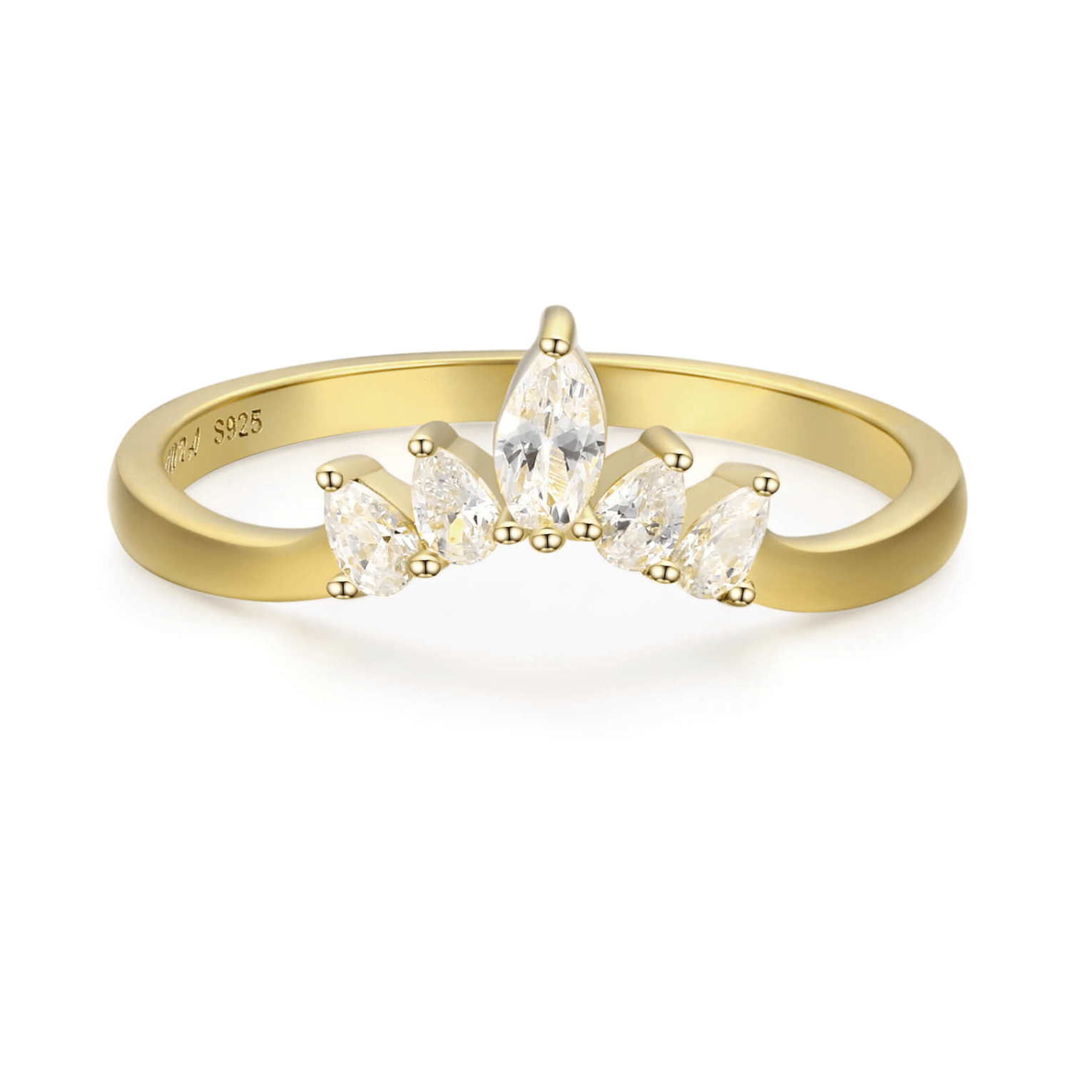 This exquisite stacking band features pear-shaped diamond-like stones, expertly set to form a regal silhouette inspired by the majestic points of a royal crown. The unique combination of these teardrop-shaped stones creates a dynamic balance of strength and grace, perfect for making a statement.