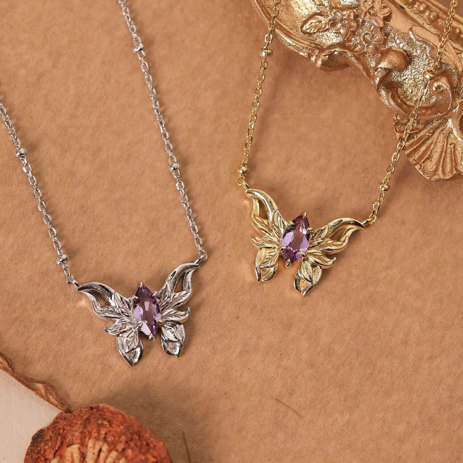 Step into a realm of enchantment with this handcrafted fairy-inspired necklace featuring radiant marquise amethyst gemstone and intricately carved leaf motifs that evoke delicate fairy wings and forest magic—crafted in 14k gold vermeil over sterling silver. Designed for dreamers, wanderers, and lovers of fae magic, this nature-inspired necklace blends elegance with deep meaning.