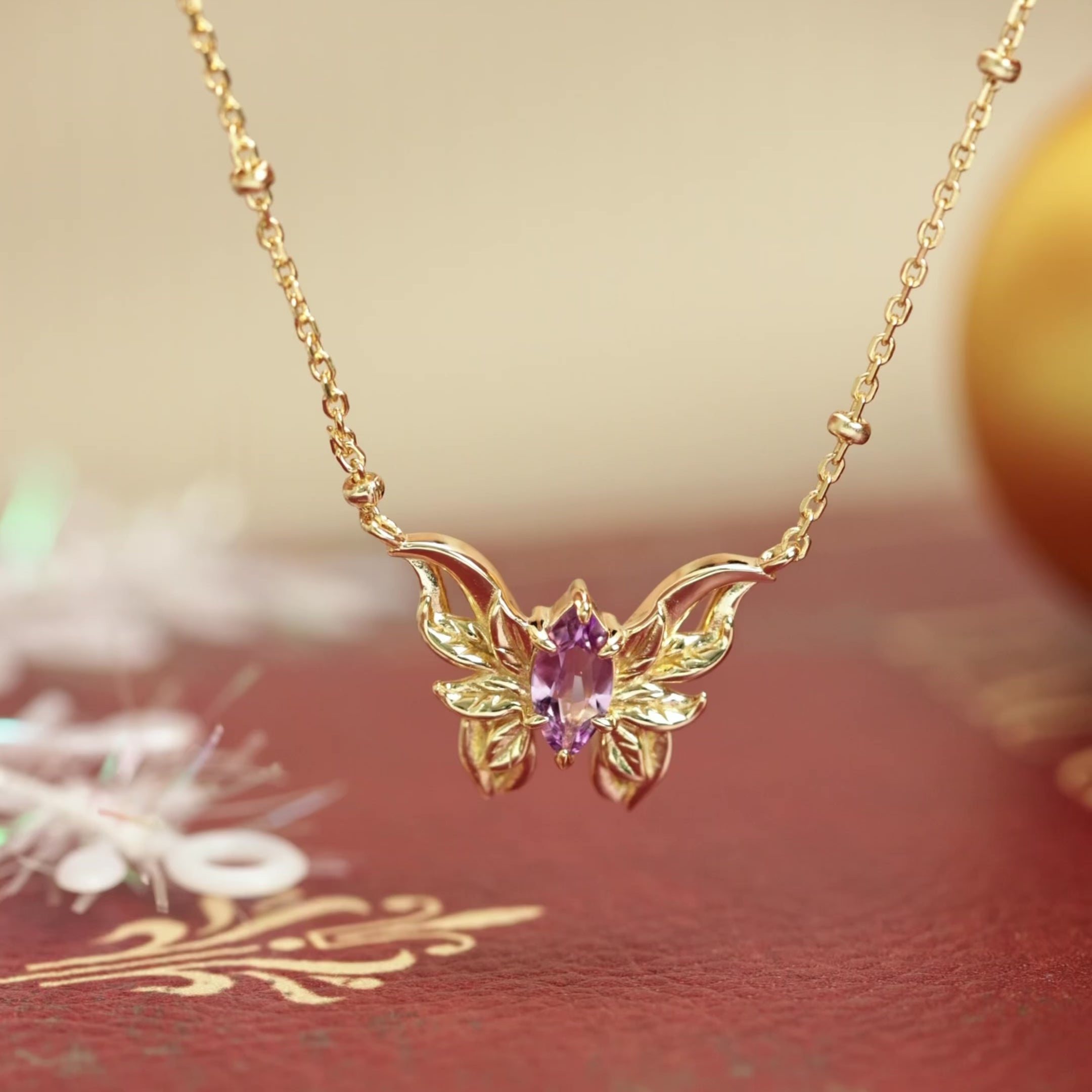 Step into a realm of enchantment with this handcrafted fairy-inspired necklace featuring radiant marquise amethyst gemstone and intricately carved leaf motifs that evoke delicate fairy wings and forest magic—crafted in 14k gold vermeil over sterling silver. Designed for dreamers, wanderers, and lovers of fae magic, this nature-inspired necklace blends elegance with deep meaning.