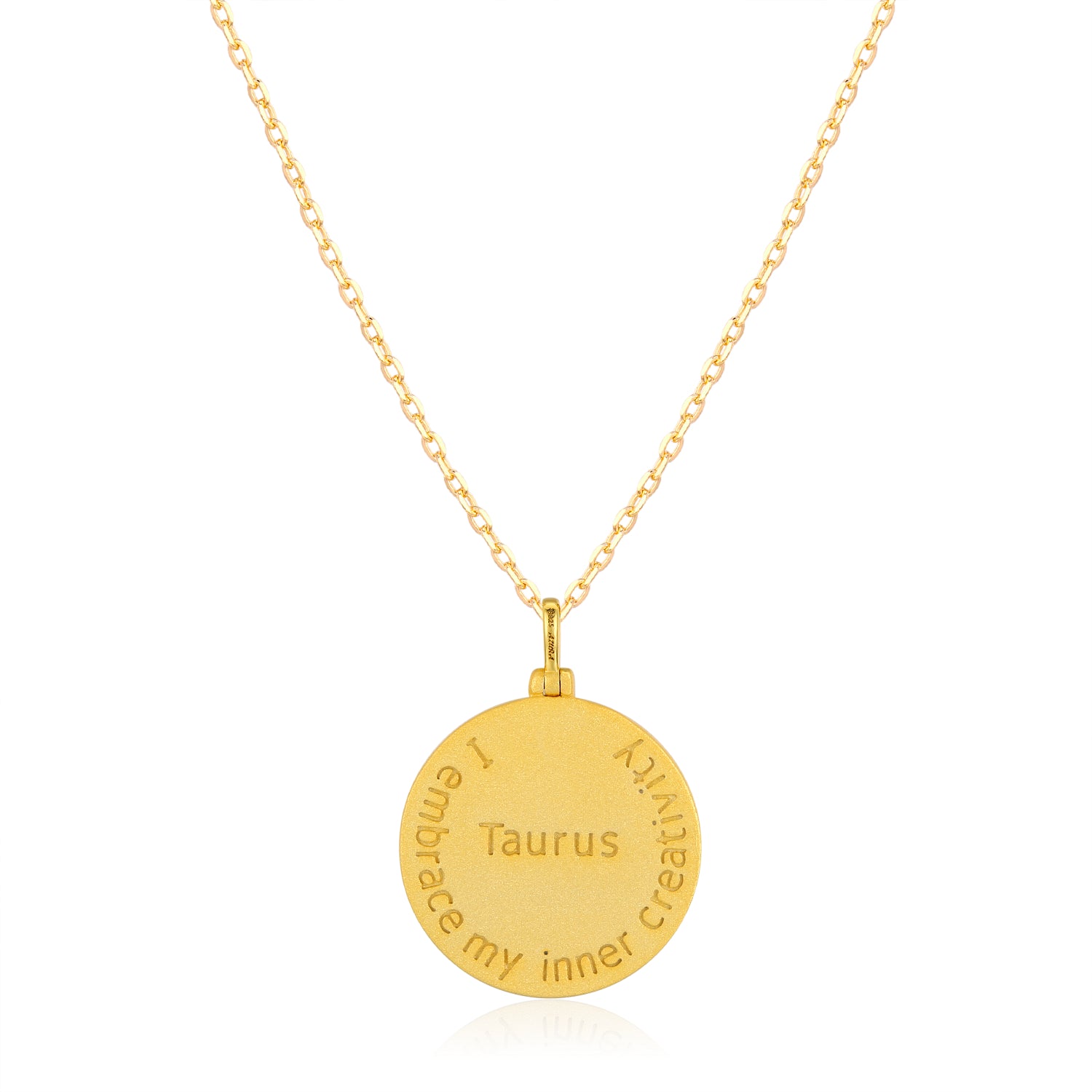The reverse side bears the empowering mantra: Taurus – “I embrace my inner creativity.” Worn close to the heart, this necklace serves as a daily reminder of resilience, artistry, and the beauty of authentic self‑expression.