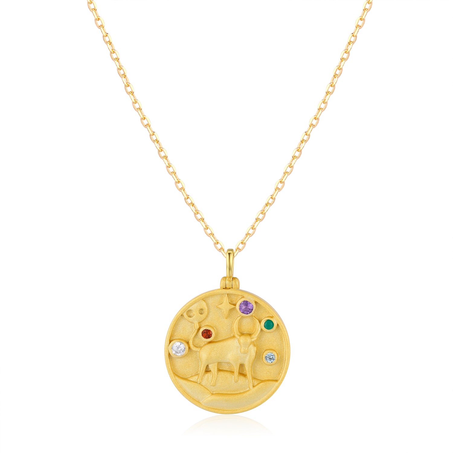 To honor this cosmic task, a talisman was made—the Taurus Zodiac Mantra Necklace. One side features the Bull standing tall in an eternal field surrounded by vibrant gemstones.