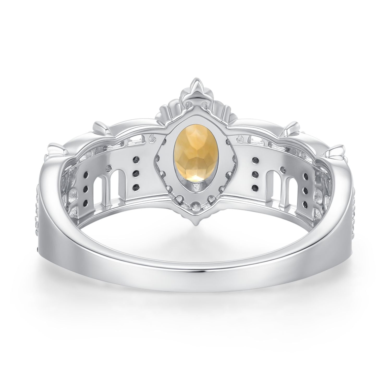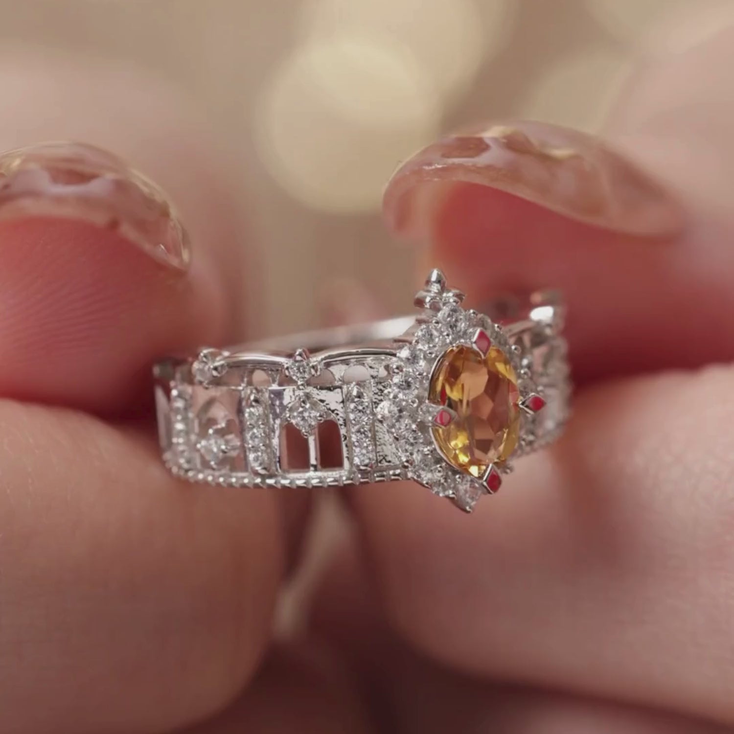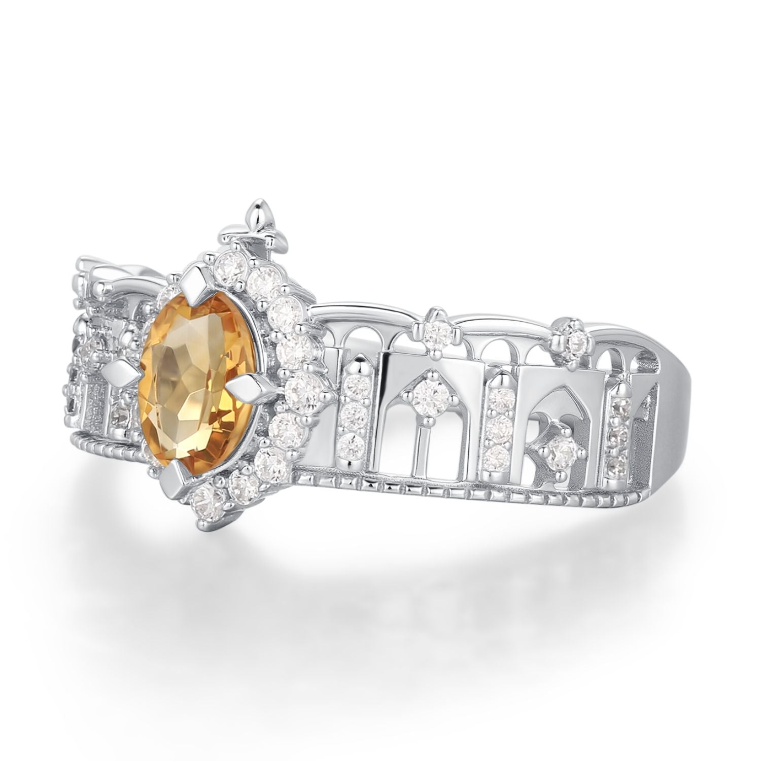 Rooted in the arches of the Alhambra in Granada, this architectural ring translates scalloped arcades and lattice rhythm into jewelry. The band repeats Moorish arches in miniature, while an oval golden citrine center is framed by bright white topaz gems—a sunlit focal point with clean geometry and everyday strength. Perfect as a statement ring for women or an architectural jewelry accent you can wear daily.