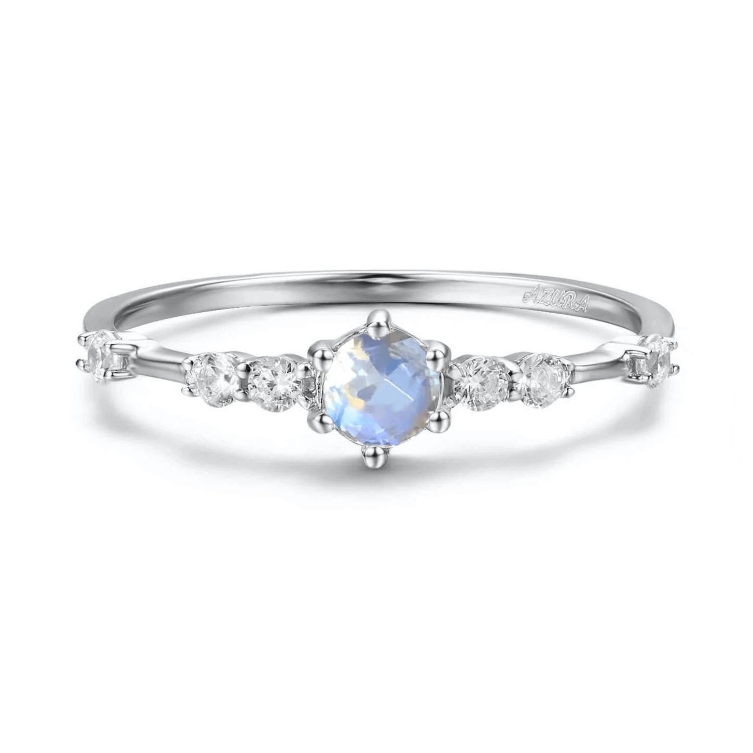 At the core lies a radiant moonstone, famed for its soft, shimmering glow that mirrors the gentle light of the moon—an ancient symbol of intuition, emotional balance, and spiritual clarity. Six equal-sized white gemstones orbit the band gracefully like a galaxy.