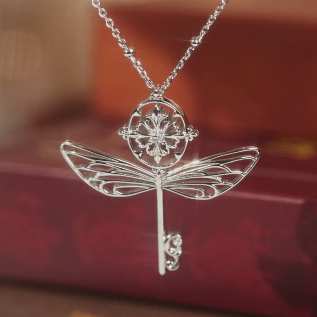The pendant features an ornate key crowned with intricate wings, symbolizing freedom, discovery, and endless possibility.