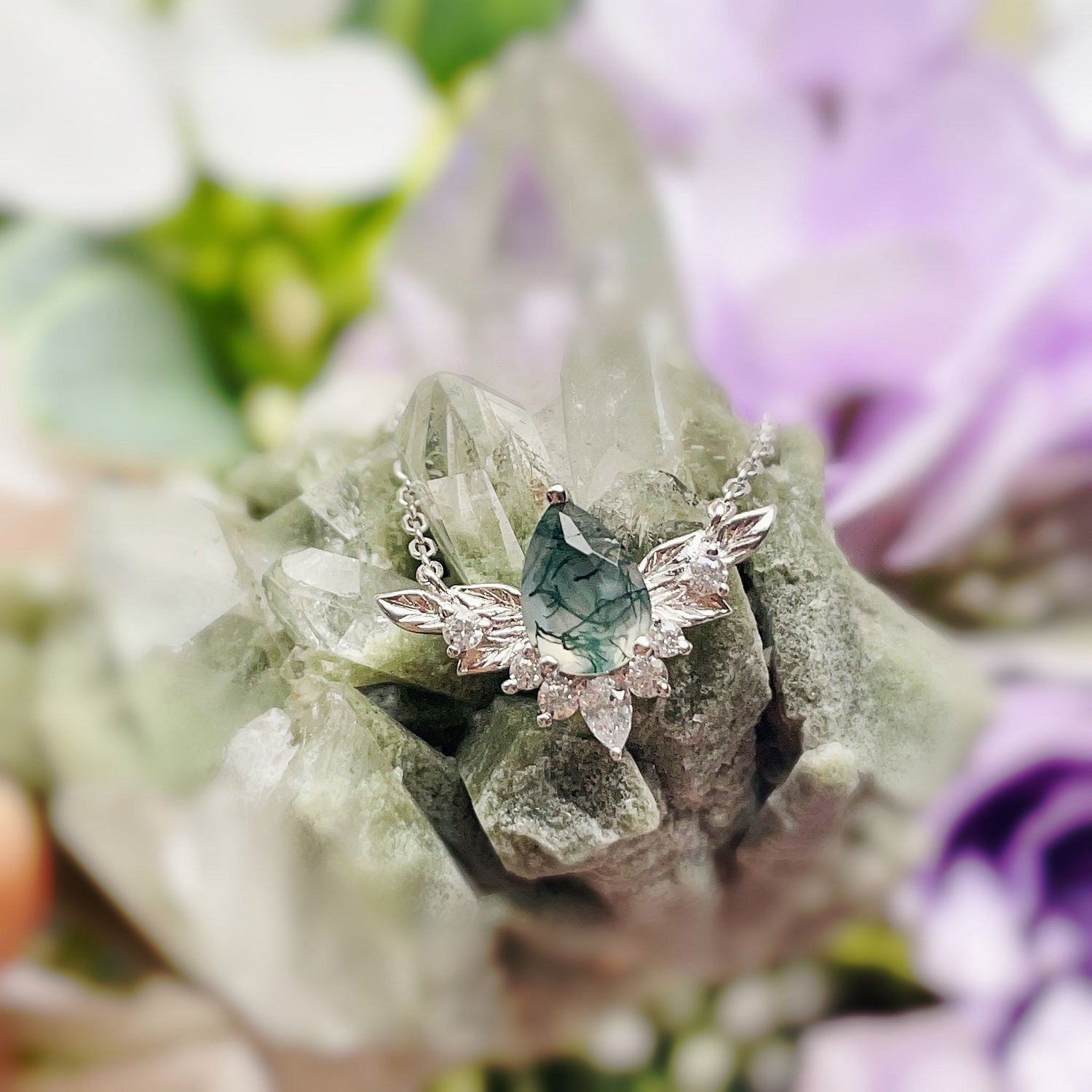 At its heart lies a captivating pear moss agate pendant that embodies nature’s resilience and timeless beauty. Its intricate natural patterns evoke the essence of a secret garden flourishing anew, symbolizing hope, growth, and transformation.