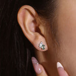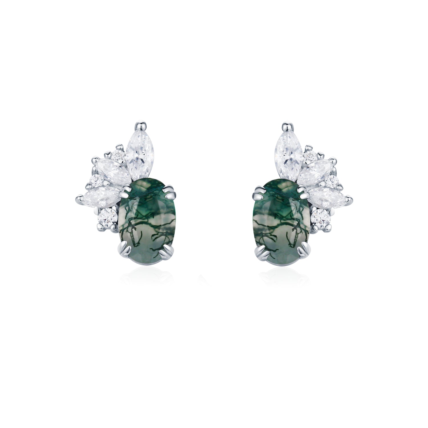 These celestial-inspired stud earrings showcase stunning oval moss agate, traced with verdant, moss-like patterns reminiscent of starlight falling upon a hidden forest. Radiating a calm, earthy glow, this enchanting stone symbolizes renewal, grounding, and gentle guidance through life’s ever-changing paths.