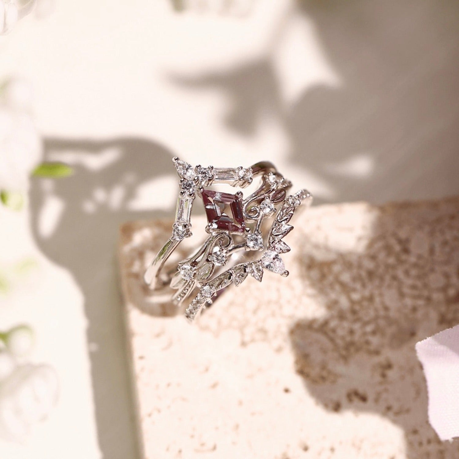 Step into a world of vintage charm and mystical beauty with the Victorian Lace Alexandrite, Monte Arc, and Woodland Ring Set, a masterpiece inspired by the delicate artistry of Victorian lacework.