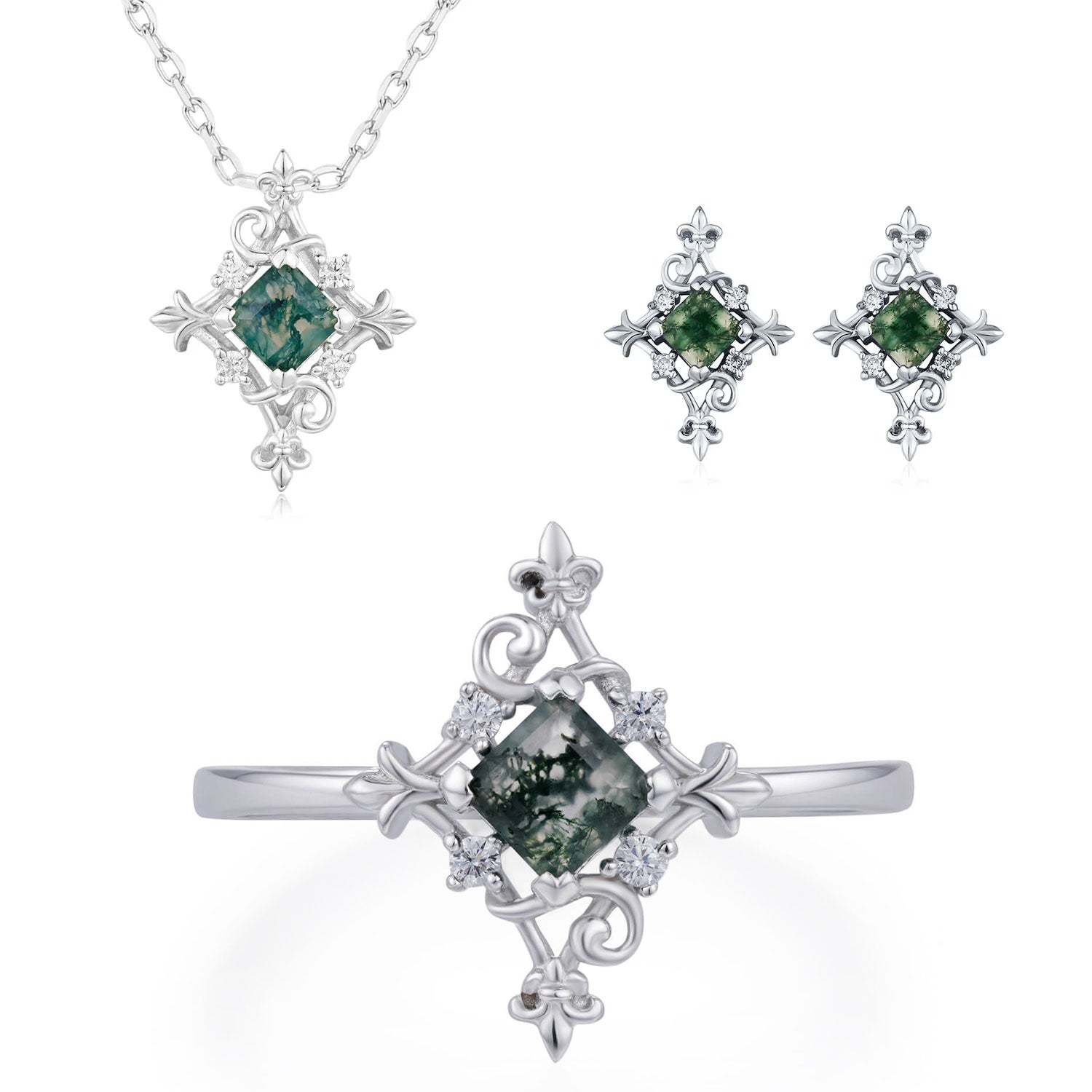 ✦ Center Stone: 4x4mm square Moss Agate (Ring and Necklace), 3.5x3.5mm square Moss Agate (Earrings)