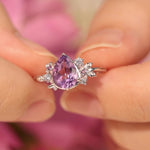 The Violet Blooms Ring captures this enchanted moment with its glowing pear gem, surrounded by delicate floral details and shimmering accents that echo the petals and dew of the magical flower.