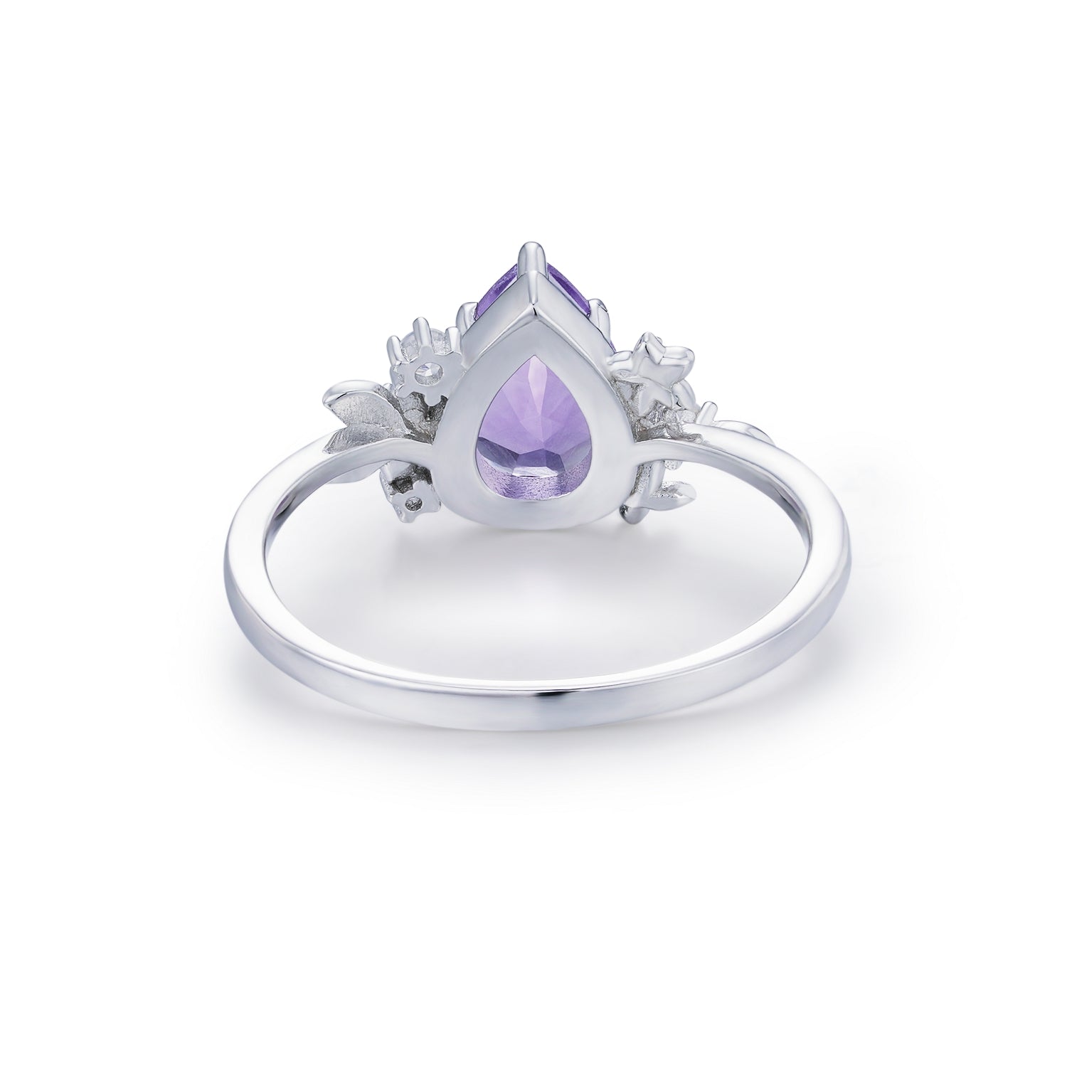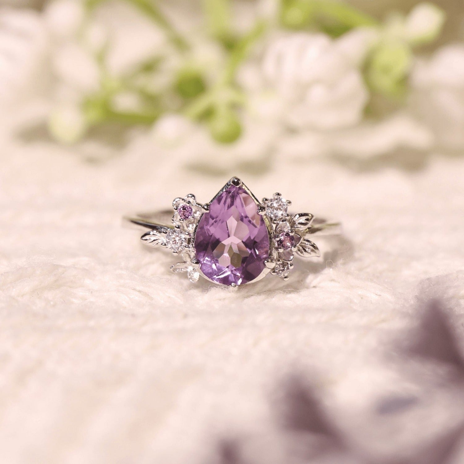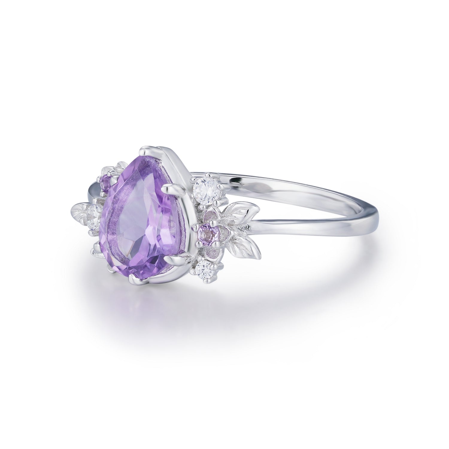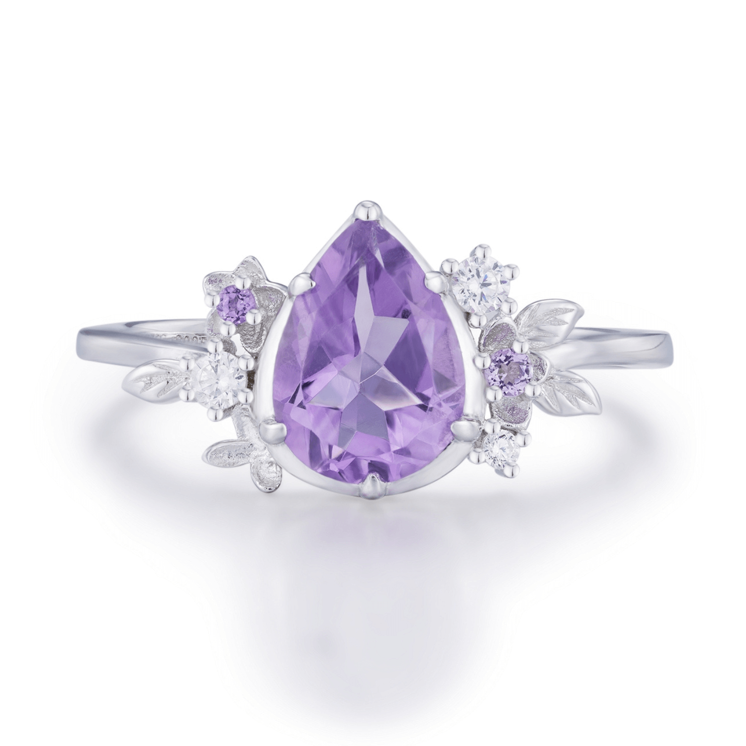 At the heart of the ring lies a stunning pear amethyst gemstone prized for its rich violet color and spiritual healing properties. Known to inspire calmness, courage, and clarity, amethyst makes this ring a powerful emblem of personal growth and transformation.