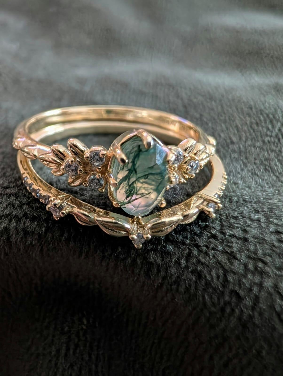 This moss agate ring is ideal as a non-traditional engagement ring, a symbolic promise ring, or a meaningful gift for nature lovers, romantics, and fans of fantasy jewelry.